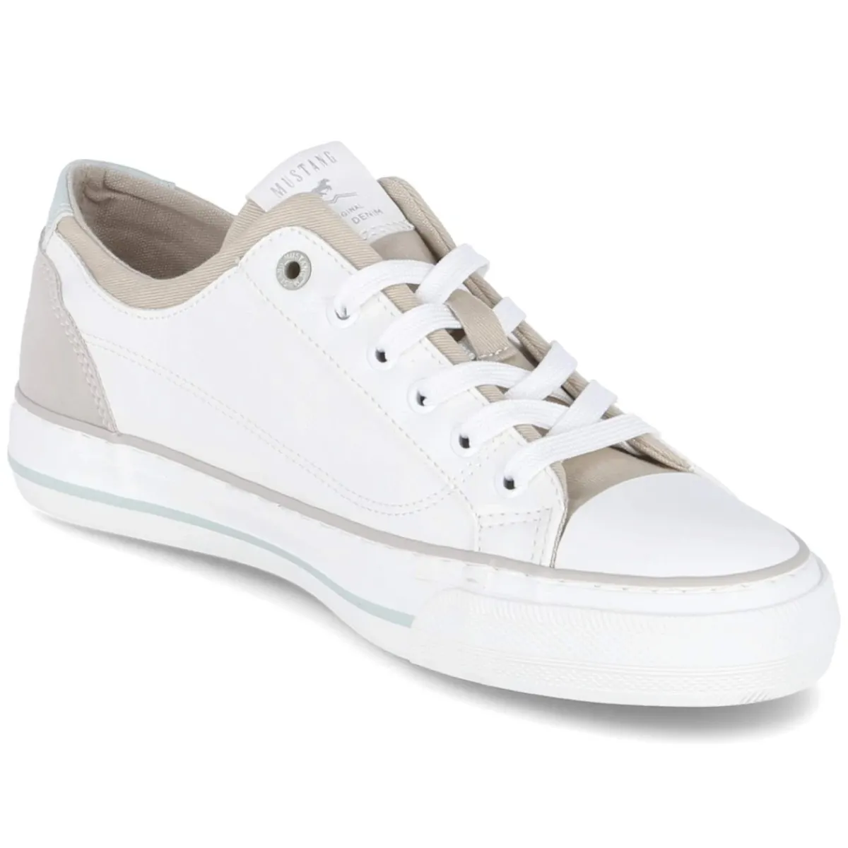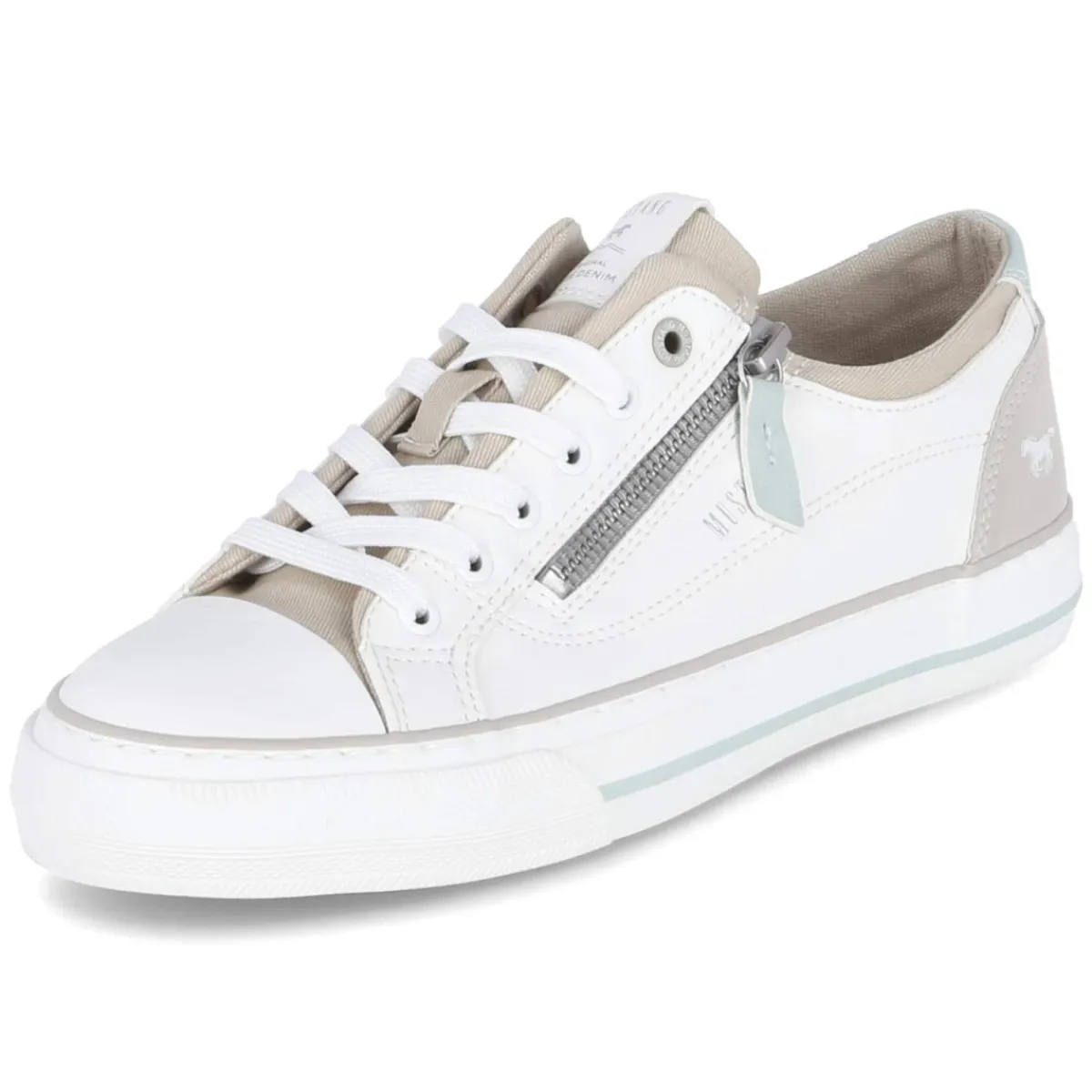 Der Low Sneaker von Mustang interpretiert den urbanen Alltagsschuh in einer frischen, weißen Ausführung mit zarten Pastellblau-Highlights. Das modern designte Obermaterial aus Textil und Synthetik trifft auf eine rutschhemmende, flexible Cupsohle, deren Bumper sich schützend über den Zehenbereich zieht. Innen sorgt ein gepolstertes Fußbett mit Decksohle aus Textil und Synthetik für angenehme Dämpfung, der verstärkte Fersenbereich stabilisiert. Schnürung und zusätzlicher Reißverschluss erleichtern den Einstieg und erlauben das schnelle Anpassen, die Passform fällt normal aus. Runde Spitze, feine Ziernähte und dezentes Branding runden den femininen Look für Damen ab. Modetipp: Besonders stimmig wirkt das Modell zu hellen Straight-Jeans, einem luftigen Streifenhemd und einem pastellblauen Cardigan, wodurch die farbigen Akzente elegant aufgenommen werden.