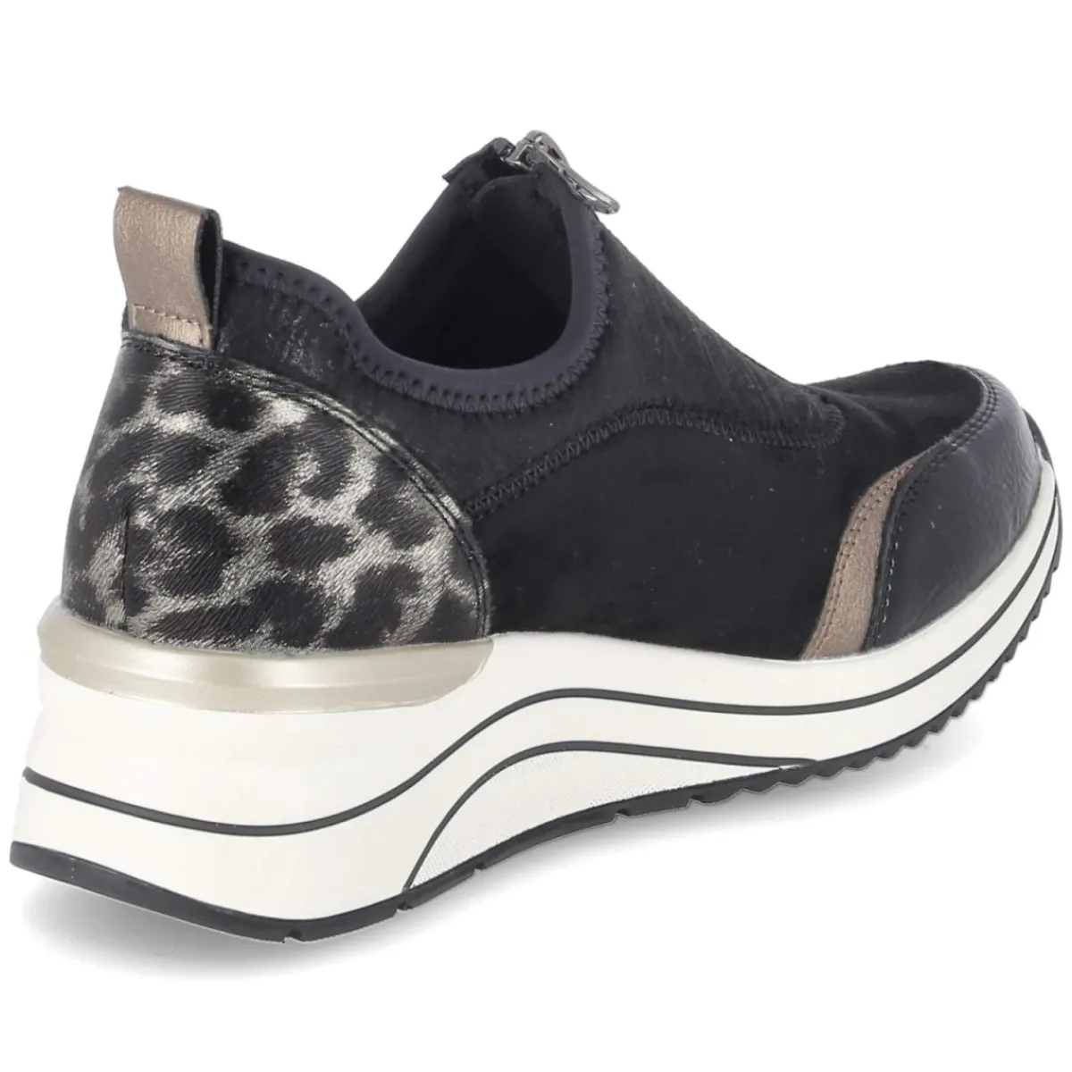 Der Remonte Low Sneaker in Schwarz vereint sportliche Linie und citytaugliche Eleganz. Das Obermaterial aus Textil und Synthetik erhält durch die Vorderkappe in Lackoptik und die goldene Leopard-Note an der Ferse markante Akzente. Ein praktischer Frontreißverschluss erleichtert den Einstieg, während die runde Spitze und der verstärkte Fersen- und Zehenbereich zusätzlichen Komfort und Schutz geben. Das komfortable Wechselfußbett sorgt gemeinsam mit der rutschfesten Laufsohle für angenehm gedämpfte Schritte. Das Modell fällt schmaler aus und setzt auf vegane Materialien – stilbewusst und tierfreundlich. Modetipp: Mit Cropped-Jeans, schwarzem Stricktop und einer kurzen Bikerjacke entsteht ein cleaner, urbaner Look, den ein goldfarbenes Armband perfekt aufgreift.