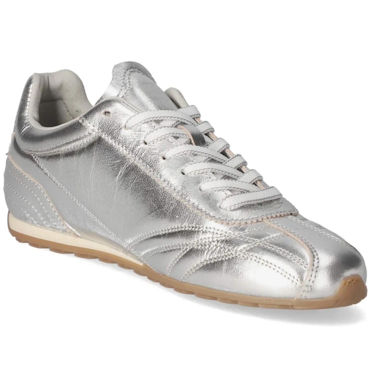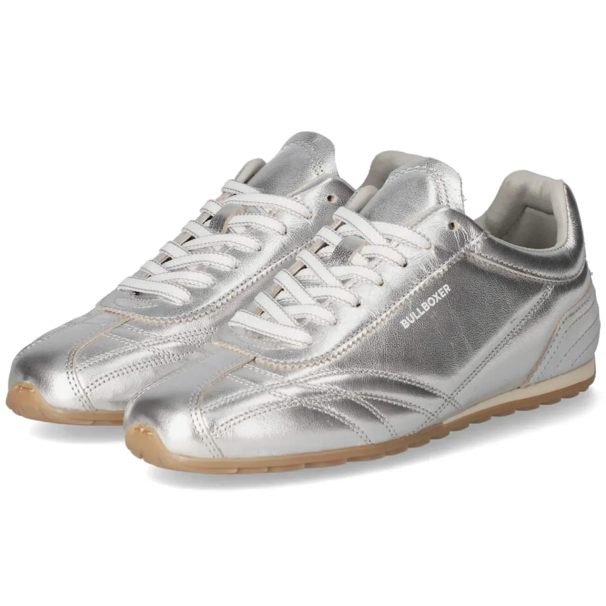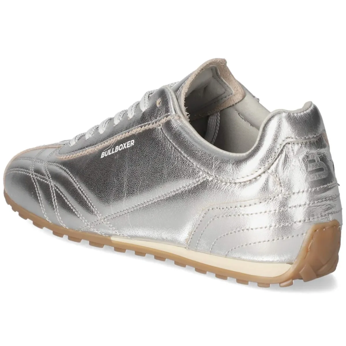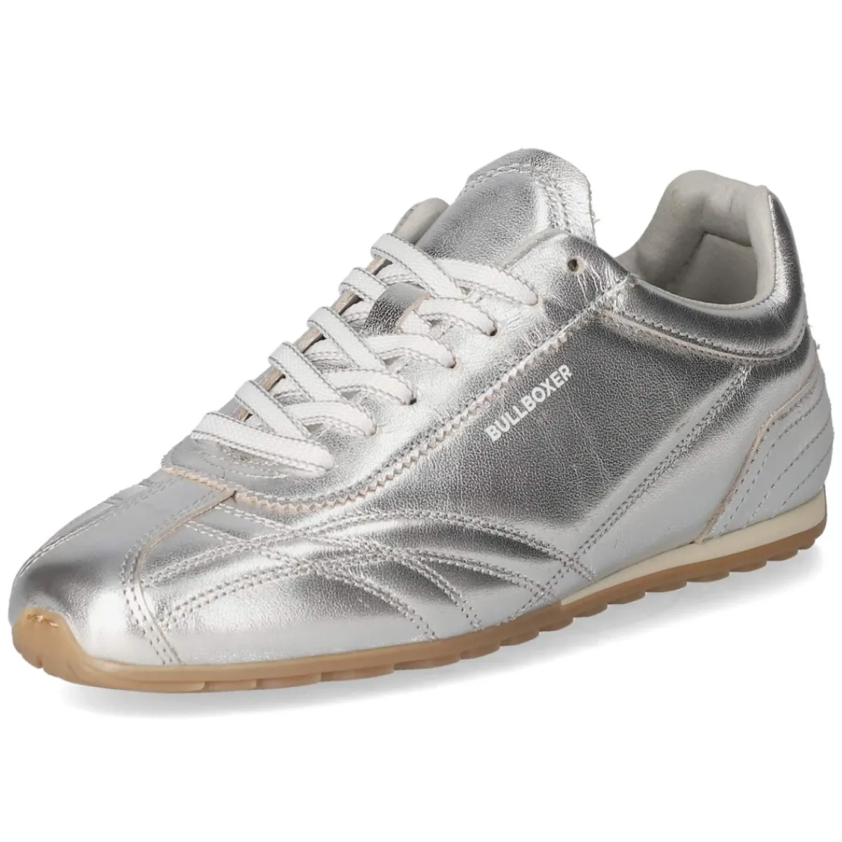 Der Bullboxer Low Sneaker setzt mit seiner elegant schimmernden Oberfläche in Silber moderne Akzente und bleibt zugleich zeitlos. Glattleder als Obermaterial, runde Schuhspitze und dynamische Ziernähte verleihen dem Design Struktur, während weißer Markenschriftzug sowie verstärkter Zehen- und Fersenbereich für einen sportlich-edlen Rahmen sorgen. Dank Schnürung lässt sich die Passform individuell regulieren; das komfortable Wechselfußbett und die textile Decksohle erhöhen den Tragekomfort im Alltag. Eine rutschfeste Profilsohle sorgt für verlässlichen Grip, der gepolsterte Einstieg schont den Knöchel. Der Sneaker fällt normal aus und begleitet vielseitig von City-Looks bis Casual Friday. Modetipp: Besonders modern wirkt das Modell zu cropped Straight-Jeans, einem weißen Shirt und einem grauen Oversize-Blazer, abgerundet mit silbernen Accessoires.