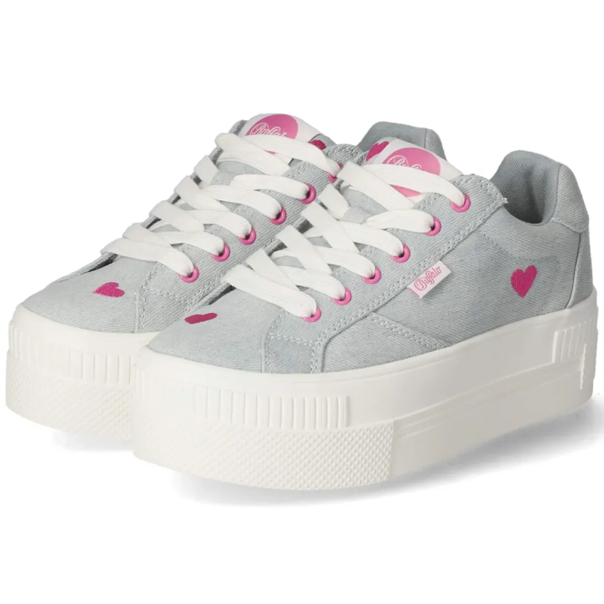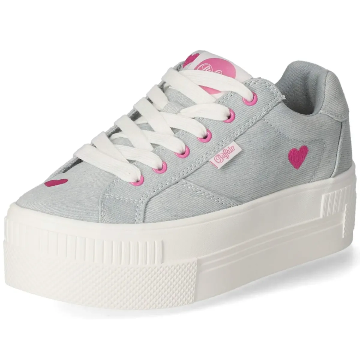 Der Low Sneaker PAIRED HEART von Buffalo setzt ein verspieltes Statement in Blau und bringt Komfort auf ein neues Level. Das leichte Textilobermaterial umschmeichelt den Fuß, während die runde Spitze und der bequem gepolsterte Einstieg den ganzen Tag über angenehmes Tragegefühl sichern. Eine markante Plateausohle mit 5 cm Höhe streckt die Silhouette, die verstärkte Ferse sorgt für Stabilität. Pinkfarbene Akzente, Herzchen und präzise Ziernähte unterstreichen den charakteristischen Look, Markendetails runden das Design ab. Dank Schnürsenkeln lässt sich die Passform individuell regulieren; das gepolsterte Wechselfußbett bietet bei Bedarf schnellen Austausch. Der Schuh fällt normal aus und eignet sich ideal für Damen, die einen frischen City-Stil bevorzugen. Modetipp: Besonders stimmig zu hellen Mom-Jeans, Cropped-Strick und einem leichten Trench in Naturtönen.