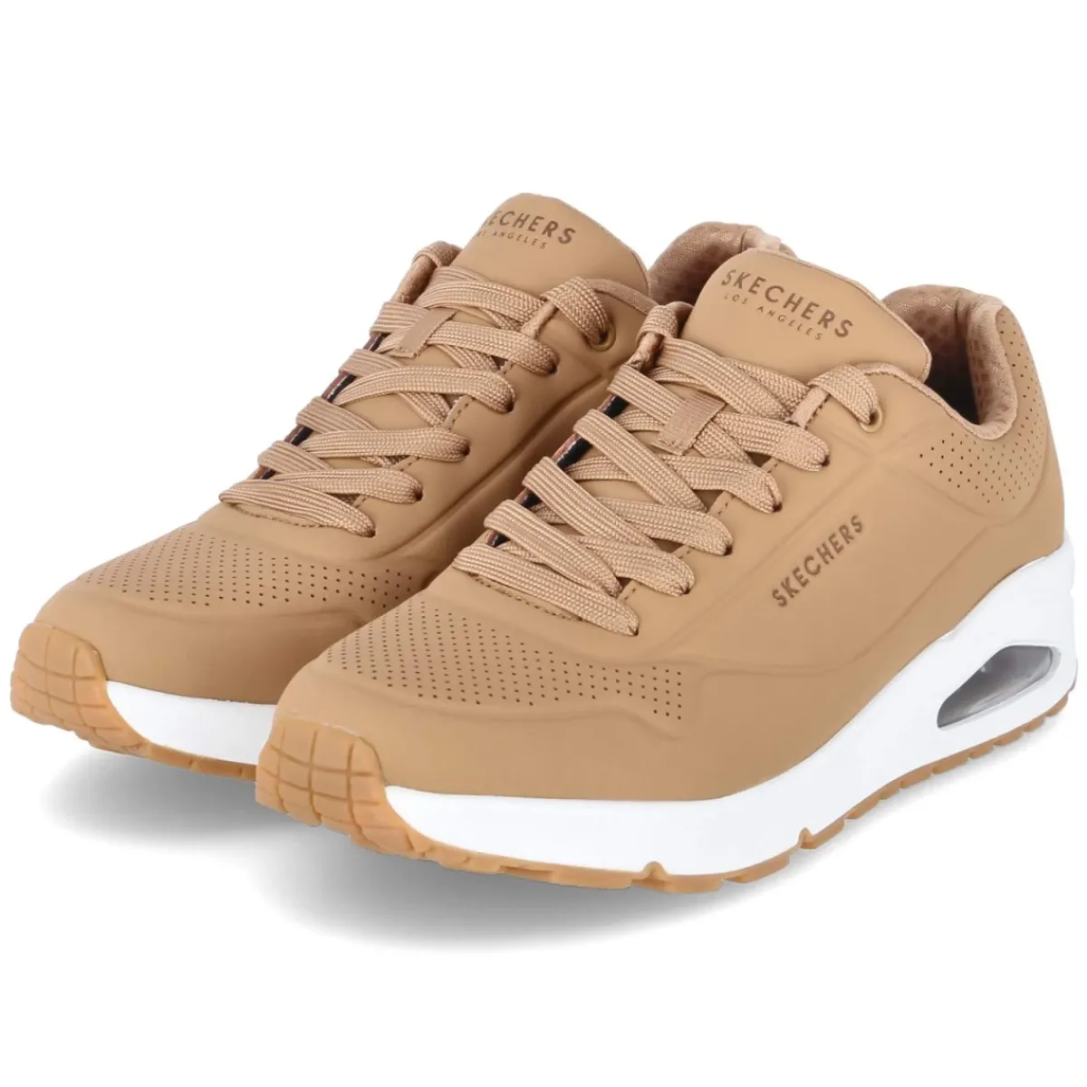 Der Low Sneaker UNO von Skechers präsentiert sich in warmem Braun und verbindet eine moderne Optik mit funktionaler Ausstattung. Das Obermaterial aus Synthetik ist pflegeleicht, die runde Schuhspitze und der Schnürverschluss sorgen für eine bequeme, passgenaue Form. Eine textile Decksohle liegt angenehm am Fuß, während die beste Memory-Foam-Fußbettung für langanhaltende Dämpfung bei jedem Schritt steht. Teile mit feiner Lochung setzen dezente Akzente und fördern ein angenehm Fußklima. Der verstärkte Zehen- und Fersenbereich verleiht Stabilität, der gepolsterte Einstieg erhöht den Tragekomfort. Die flexible, rutschhemmende Profilsohle bietet zuverlässigen Grip und zeigt ein markantes Sichtfenster als dynamisches Detail. Der Schuh fällt normal aus und richtet sich an Herren, die Alltag und Freizeit stilvoll verbinden möchten. Modetipp: Zu schmalen Chinos, offener Overshirt-Jacke und cleanem T-Shirt wirkt das Braun besonders wertig und vielseitig.