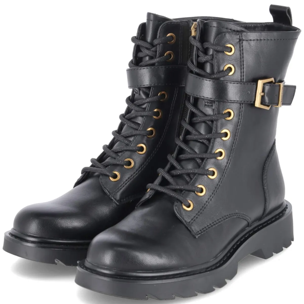 Der Bikerboot von Tamaris kombiniert rebellische DNA mit edler Optik in sattem Schwarz. Das vegane Obermaterial aus hochwertigem Synthetik zeigt eine runde Spitze, während der stabile Blockabsatz von 4 cm souveränen Halt gibt. Dank Schnürsenkeln und seitlichem Reißverschluss gelingt der Einstieg komfortabel; Anziehlasche und verstärkter Fersenbereich erhöhen die Alltagstauglichkeit. Ein weich gepolstertes Fußbett mit textiler Decksohle schont lange Tage, die flexible, rutschfeste Profilsohle sorgt für Grip. Zierriemen mit Schnalle am Knöchel und Beschläge in warmer Kupferoptik setzen markante Akzente. Der Schnitt fällt normal aus und passt vielseitig in die Garderobe – von Büro bis Bar. Modetipp: Zu Skinny-Jeans, weißem T‑Shirt und oversized Wollmantel entsteht ein klarer City-Look, den eine strukturierte Crossbody abrundet.