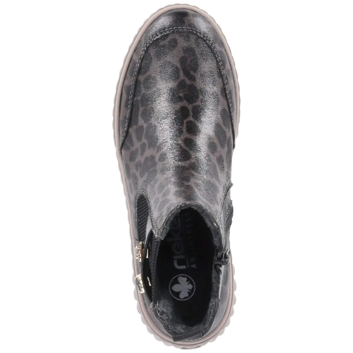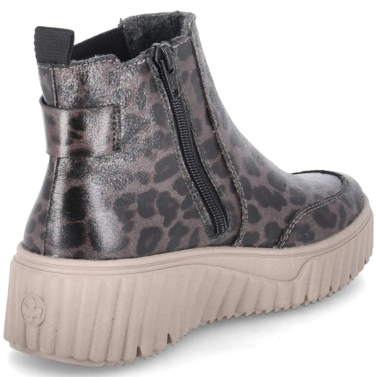Die Damen-Chelsea Boots von Rieker präsentieren sich in edlem Grau mit angesagtem Animal Print und fallen größengetreu aus. Vegane Materialien und ein synthetisches Obermaterial treffen auf eine textile Decksohle und leichtes Futter, das an kühlen Tagen angenehm wärmt. Der seitliche Reißverschluss und die Anziehlasche erleichtern den Einstieg, während runde Schuhspitze und verstärkter Zehenbereich Alltagstauglichkeit unterstreichen. Ein Knöchelriemen mit zwei goldschimmernden Broschen setzt einen stilvollen Akzent, das herausnehmbare Fußbett sorgt für individuellen Komfort. Die rutschfeste Laufsohle bietet sicheren Halt, ideal für urbane Wege. Modetipp: Mit grauem Wollmantel, schwarzer Slim-Jeans und feinem Goldschmuck die eleganten Details aufgreifen; ein cremefarbenes Strickkleid lässt das Leopardenmuster besonders edel wirken.
