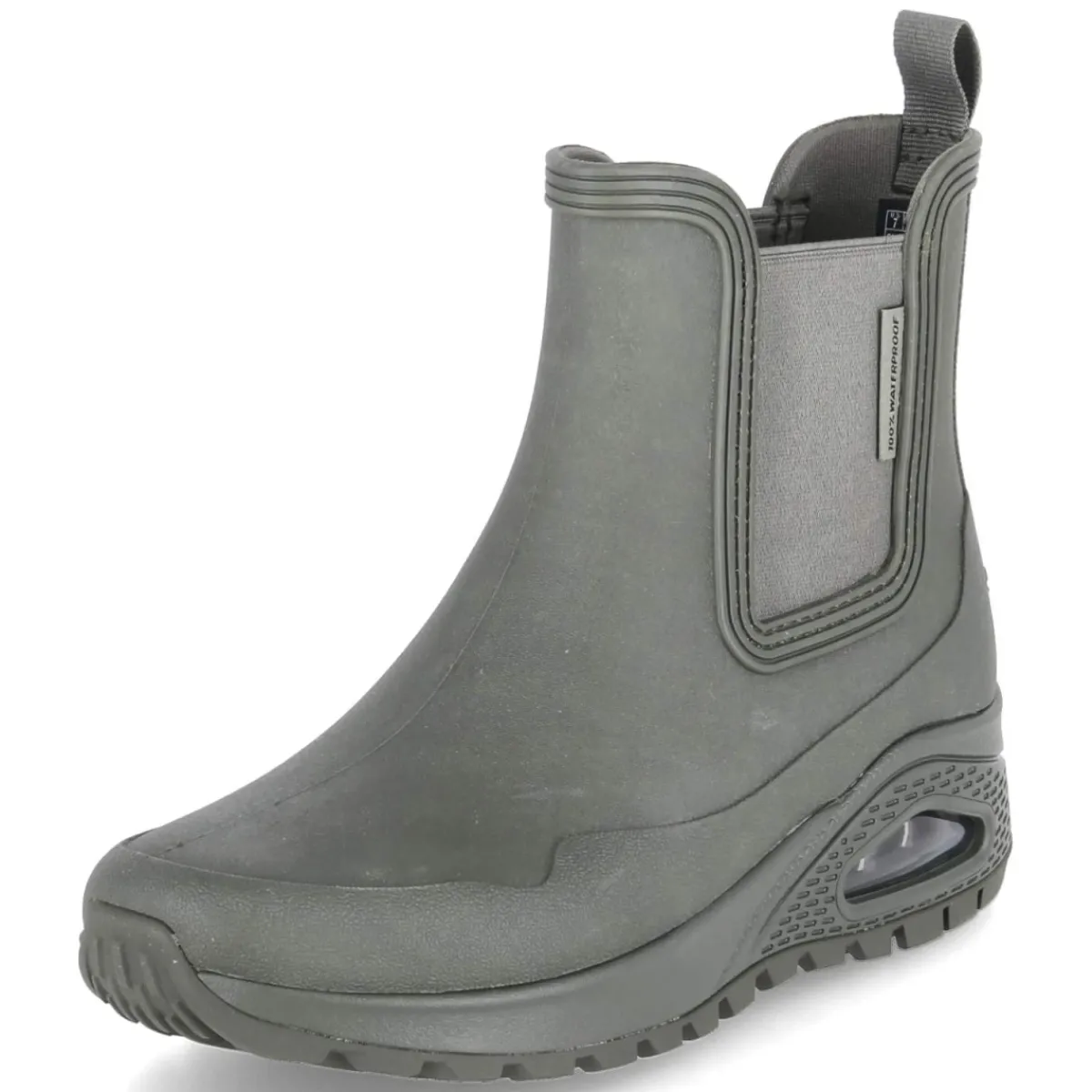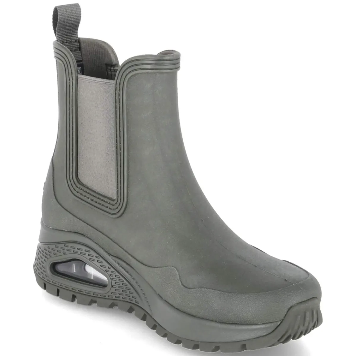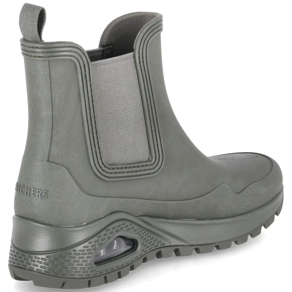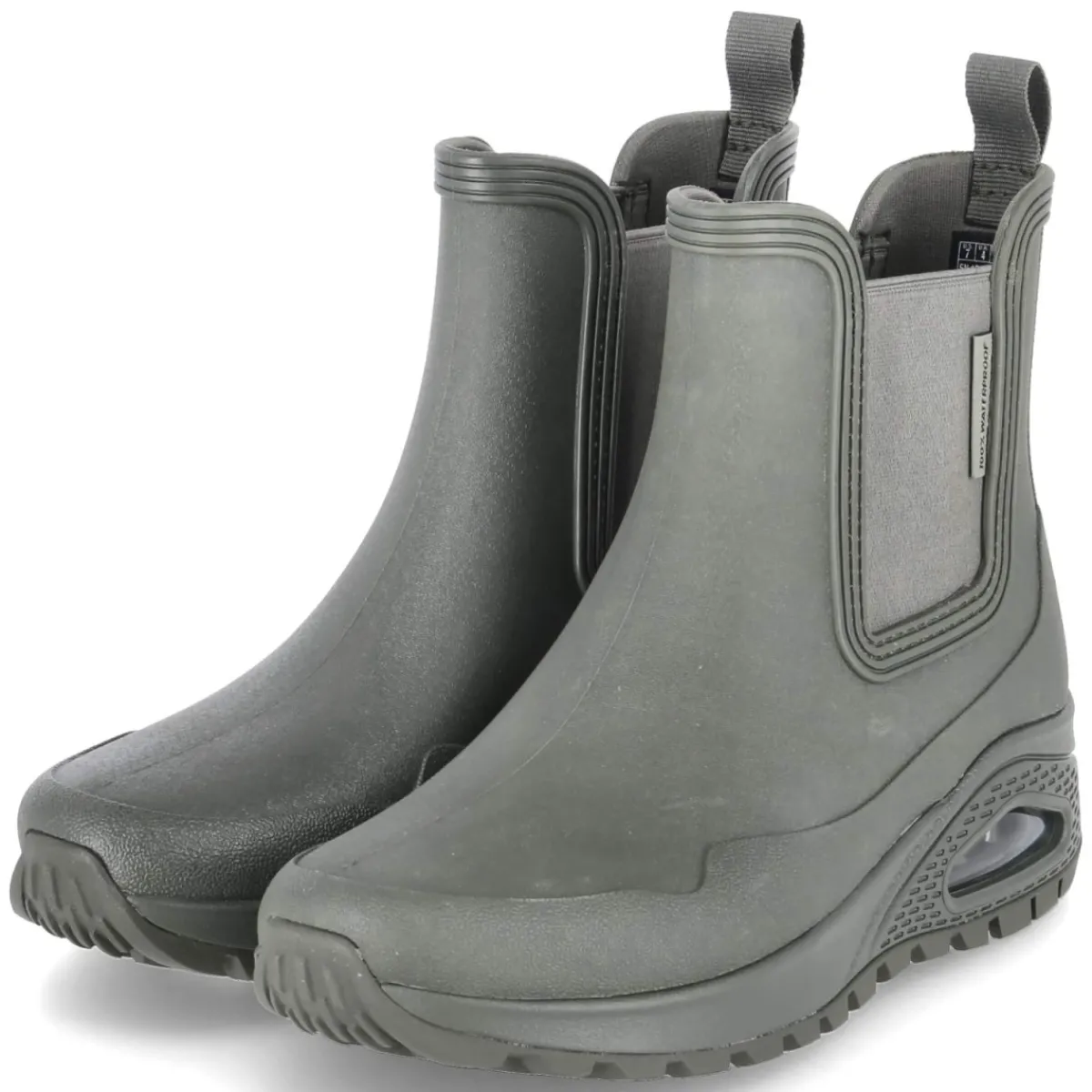 Die Gummistiefeletten UNO RUGGED von Skechers verbinden urbanen Regenwetterschutz mit modernem Style. Das wasserfeste Obermaterial aus Synthetik in sattem Grün hält bei Schauern zuverlässig trocken, während die Chelsea-Silhouette DANCING N THE RAIN mit zwei Elastikeinsätzen und Anziehlasche ein schnelles Hineinschlüpfen ermöglicht. Die sportliche, rutschfeste Profilsohle mit Sichtfenster sorgt für sicheren Halt auf nassem Untergrund, der verstärkte Fußrahmen verleiht Stabilität. Innen verwöhnt eine textile Decksohle mit erstklassiger Memory-Foam-Fußbettung, die selbst auf langen Wegen komfortabel abfedert. Die runde Schuhspitze und die normale Passform machen den Allrounder alltagstauglich vom Büro bis zum Wochenendspaziergang. Modetipp: Zur verkürzten Straight-Leg-Jeans, Feinstrick und Oversize-Trench wird das Grün zum frischen Farbakzent.