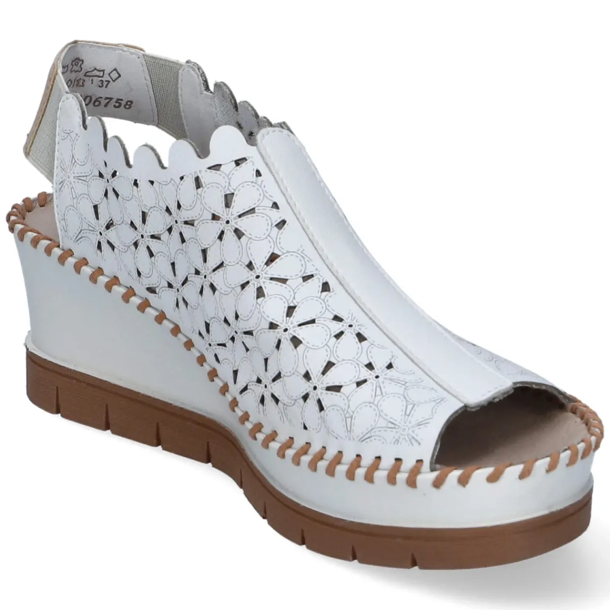 Die weißen Keilsandaletten von Rieker verbinden sommerliche Leichtigkeit mit Komfort und langlebiger Qualität. Glattes Echtleder umschmeichelt den Fuß, während die hautfreundliche Lederdecksohle mit leichter Vorformung und Polsterung für angenehmes Auftreten sorgt. Der 6,5 cm hohe Keilabsatz schenkt eine feminine Silhouette und bleibt dank ausgewogener Auftrittsfläche stabil. Ein elastischer Einstieg und der Fersenriemen mit Elastikeinsatz erleichtern das Hineinschlüpfen ohne Verschluss, die flexible, rutschhemmende Laufsohle bietet Halt auf unterschiedlichen Untergründen. Das florale Lochmuster mit breitem Riemen und markanten Nähten verleiht dem Design einen modernen, detailverliebten Look. Die Passform fällt normal aus und eignet sich für den täglichen Einsatz in der Stadt ebenso wie für festliche Anlässe. Modetipp: Zu einem knöchellangen Leinenkleid und einer strukturierten Basttasche entsteht ein frischer Sommer-Look, der die floralen Akzente stilvoll aufgreift.
