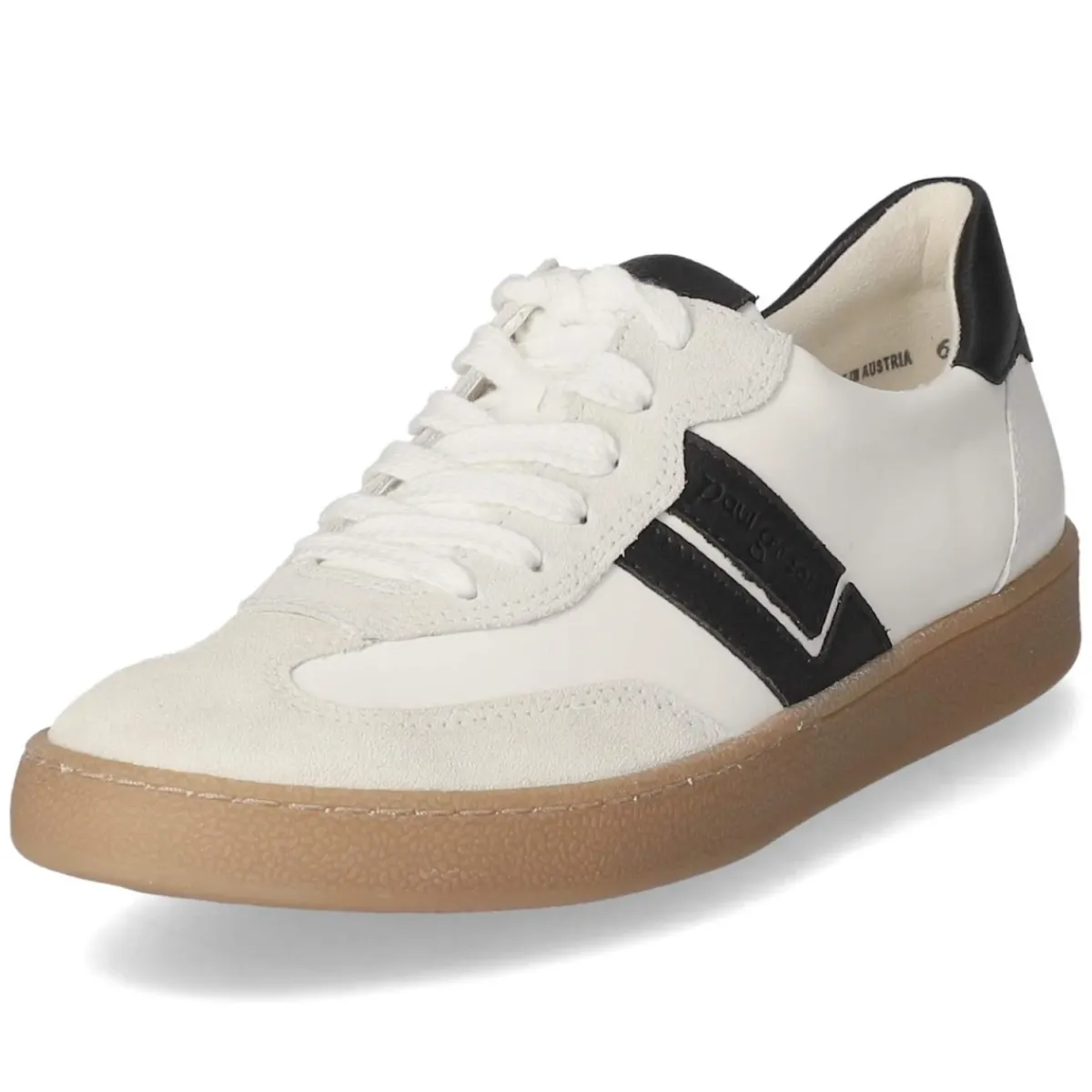 Der Low Sneaker von Paul Green verbindet sportliche Leichtigkeit mit zeitloser Eleganz. Das weiße Obermaterial aus atmungsaktivem Echtleder wird durch schwarz- und beigefarbene Akzente stilvoll betont, während die runde Schuhspitze den cleanen Look abrundet. Der bequem gepolsterte Einstieg und die individuell regulierbare Schnürung sorgen für hohen Komfort im Alltag. Eine lederne Decksohle und das gepolsterte, vorgeformte Fußbett bieten ein angenehm natürliches Tragegefühl. Verstärkte Zehen- und Fersenbereiche erhöhen die Langlebigkeit, die flexible, rutschhemmende Laufsohle gibt verlässlichen Halt. Der Fit fällt normal aus, der Markenschriftzug setzt ein dezentes Statement. Modetipp: Zu Cropped-Jeans und einem cremefarbenen Stricktop entfaltet der Sneaker seine moderne, hochwertige Wirkung.
