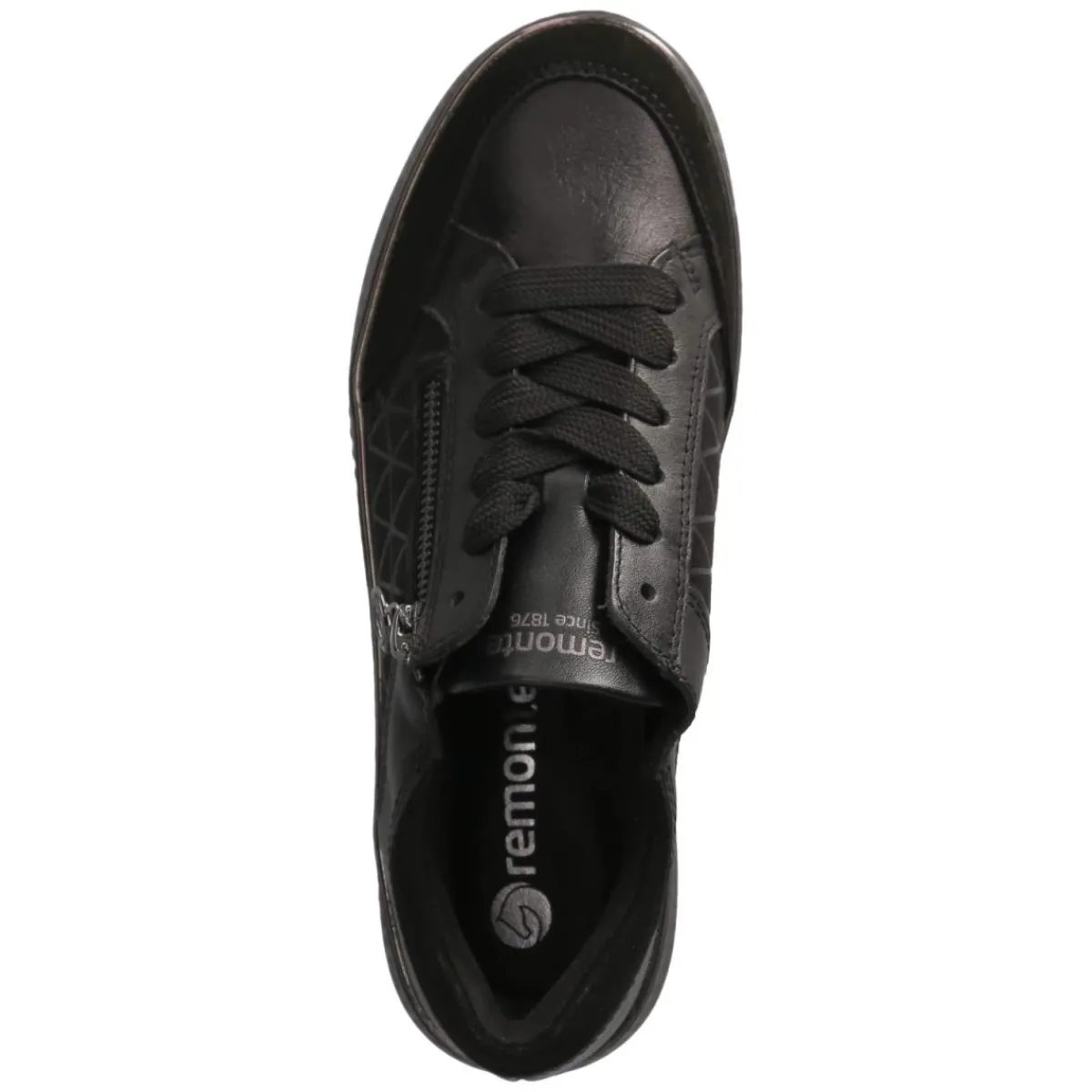 Der Low Sneaker von Remonte verbindet urbanen Chic mit funktionaler Bequemlichkeit. Schwarzes Glattleder aus atmungsaktivem Echtleder legt sich weich an und wird durch verstärkte Zonen aus Rauleder an Zehen und Ferse robust ergänzt. Schnürung und zusätzlicher Reißverschluss ermöglichen einen schnellen Einstieg und eine passgenaue Weitenregulierung. Der rund gearbeitete Leisten, ein bequem gepolsterter Einstieg sowie die gepolsterte, herausnehmbare Textil-Decksohle sorgen für langanhaltenden Komfort. Optisch setzen geometrische Partien und der platinfarbene Schuhrahmen moderne Akzente, während die flexible, rutschhemmende Laufsohle sicheren Grip bietet. Der Größenhinweis fällt kleiner aus, daher wird eine Nummer größer empfohlen. Modetipp: Zu Cropped-Jeans und einem cleanen Blazer entfaltet der metallische Rahmen seine Wirkung; silberne Accessoires greifen die Nuance elegant auf.