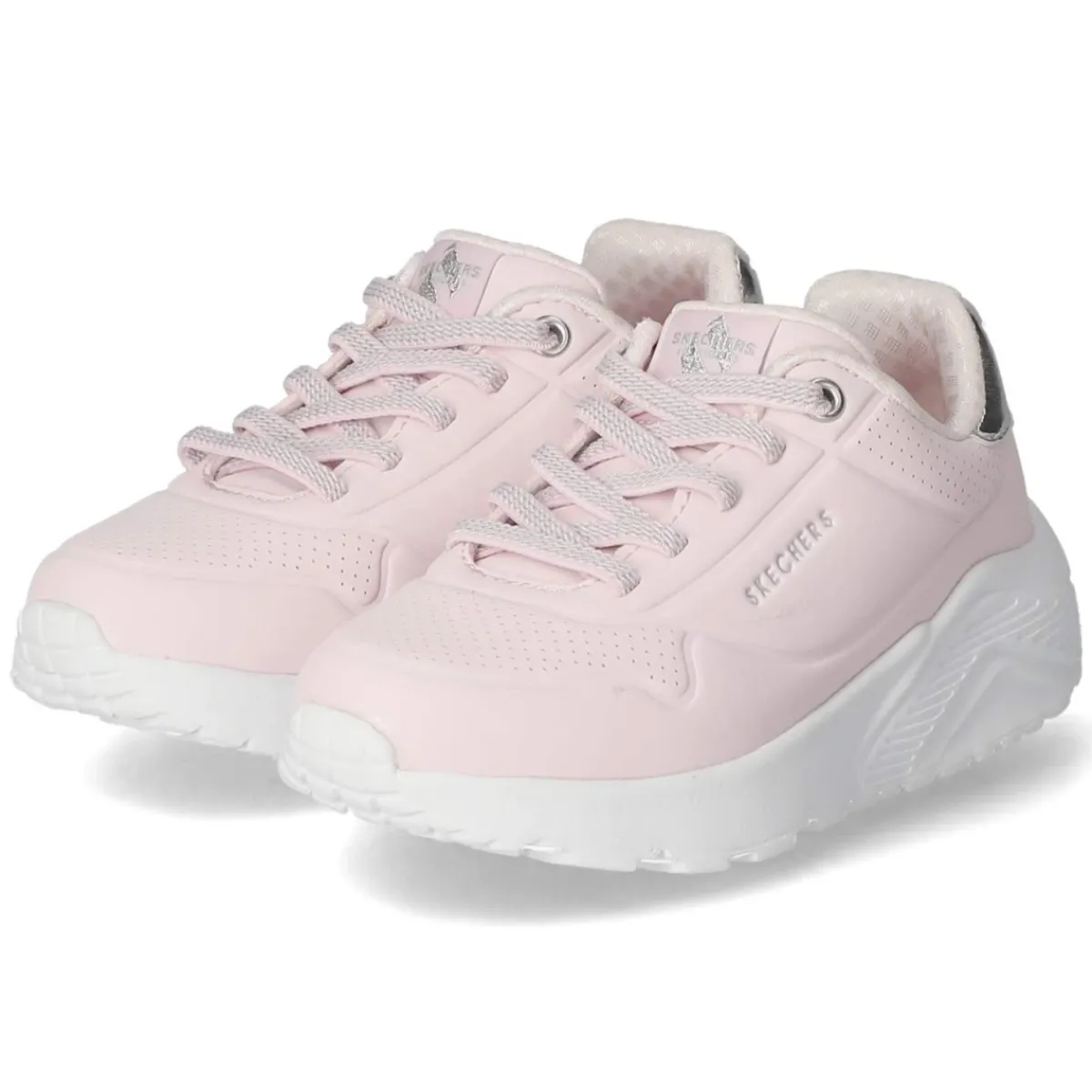 Der Low Sneaker METALLIC MODE von Skechers setzt mit schimmerndem Pink und silberfarbenen Akzenten ein funkelndes Statement im Kinder-Alltag. Das Obermaterial aus pflegeleichtem Synthetik zeigt perforierte Zonen für ein luftiges Trageklima, während der gepolsterte Einstieg und die rund geformte Spitze Komfort und Bewegungsfreiheit unterstützen. Die textilbezogene Memory-Foam-Decksohle passt sich weich an den Fuß an und federt Schritte sanft ab. Eine Schnürung mit Elastikband erleichtert das Anziehen, die reguläre Schnürung sorgt anschließend für individuelle Anpassung und zuverlässigen Halt. Der verstärkte Zehen- und Fersenbereich macht den Schuh spielplatztauglich, die flexible Non-Marking-Laufsohle bietet rutschhemmenden Grip – ideal auch für Turnhallen. Fällt normal aus und ist maschinenwaschbar. Modetipp: Zum Glanz-Look passen Jeans in Hellwaschung und ein grafisch bedrucktes Sweatshirt oder Leggings mit Metallic-Details.