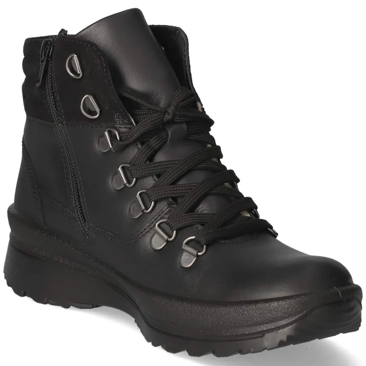 Die Beliana Schnürstiefeletten setzen auf eine cleane Silhouette in sattem Schwarz und überzeugen mit durchdachter Funktion. Glattes Leder trifft auf eine TEX-Ausstattung mit wasserfest verarbeitetem Obermaterial, das Nässe zuverlässig abhält. Innen sorgt ein leichtes Futter für angenehme Wärme an kühlen Tagen, während die textile Decksohle und das gepolsterte Fußbett den Komfort spürbar erhöhen. Die Kombination aus Schnürung, praktischem Innenreißverschluss und zusätzlichem Zipper erleichtert den Einstieg, Anziehhilfe und verstärkte Ferse bringen Stabilität. Eine flexible, rutschfeste Laufsohle liefert guten Grip, die runde Spitze schafft Platz und trägt sich entspannt. Fällt normal aus und passt vielseitig in die Garderobe. Modetipp: Mit Midikleid aus Strick und Oversize-Cardigan entsteht ein lässiger Kontrast zwischen femininer Linie und robustem Boot.