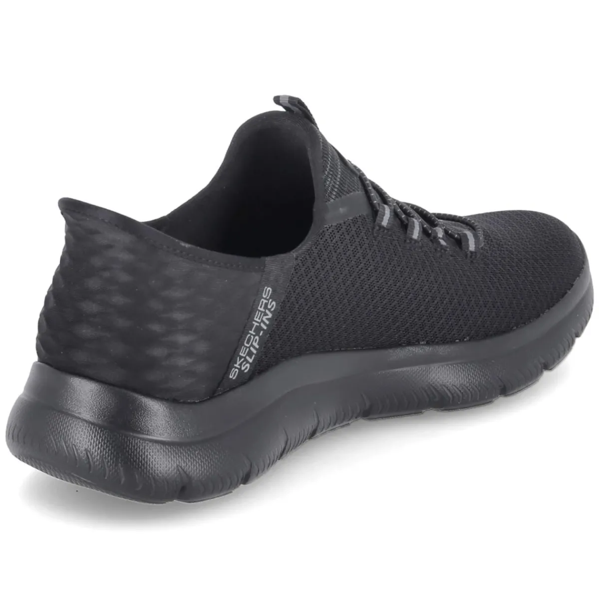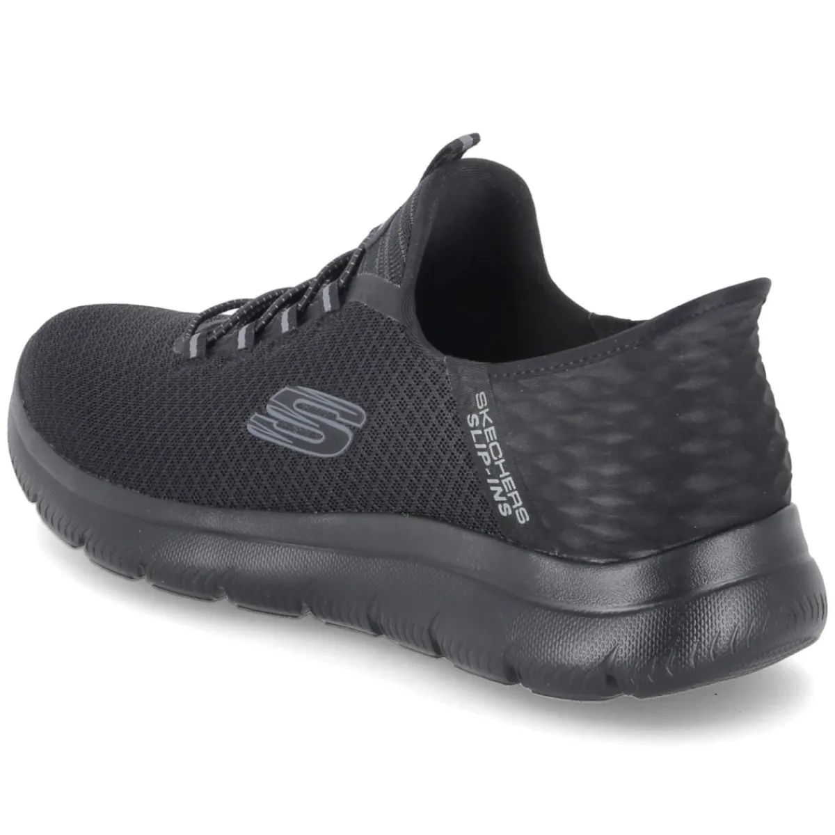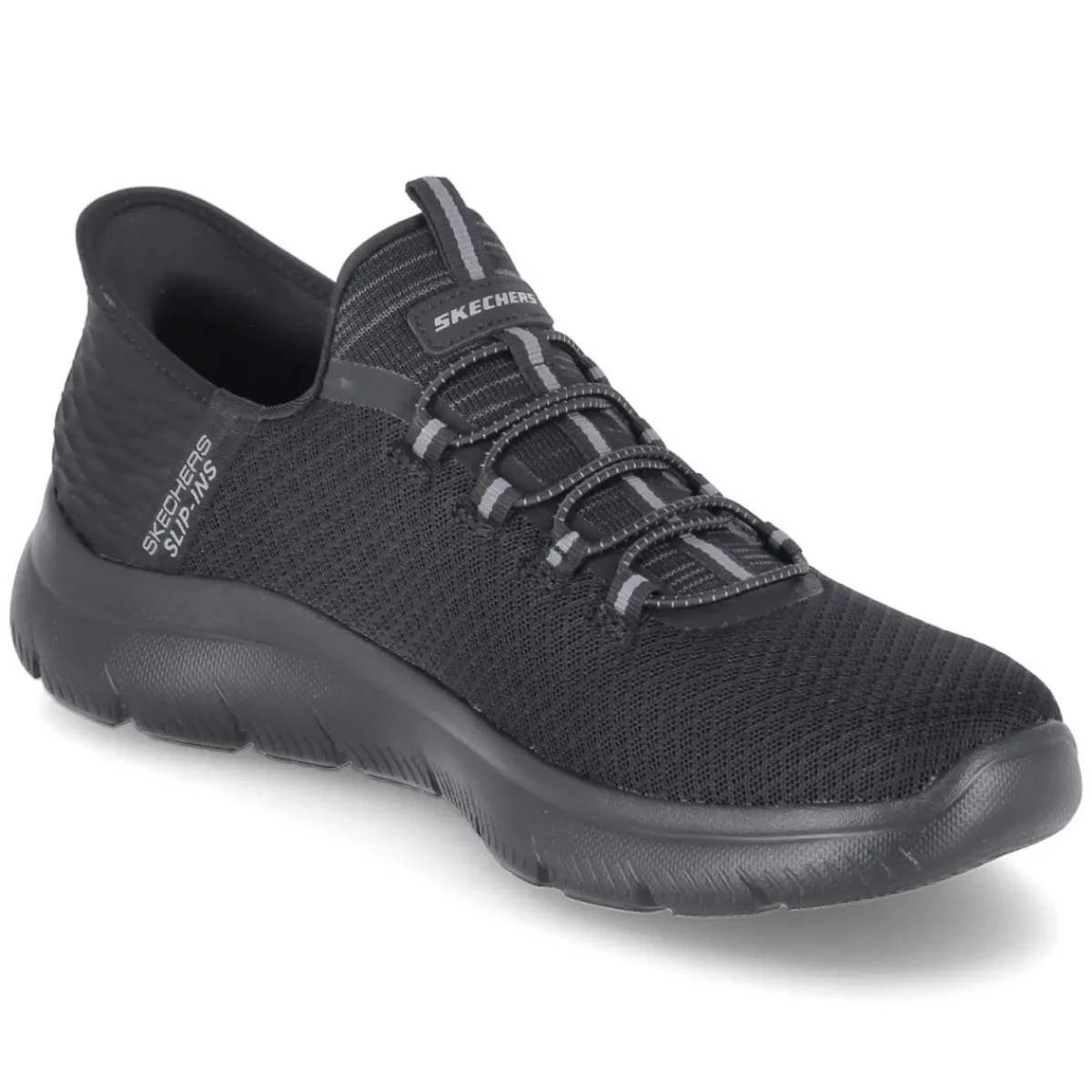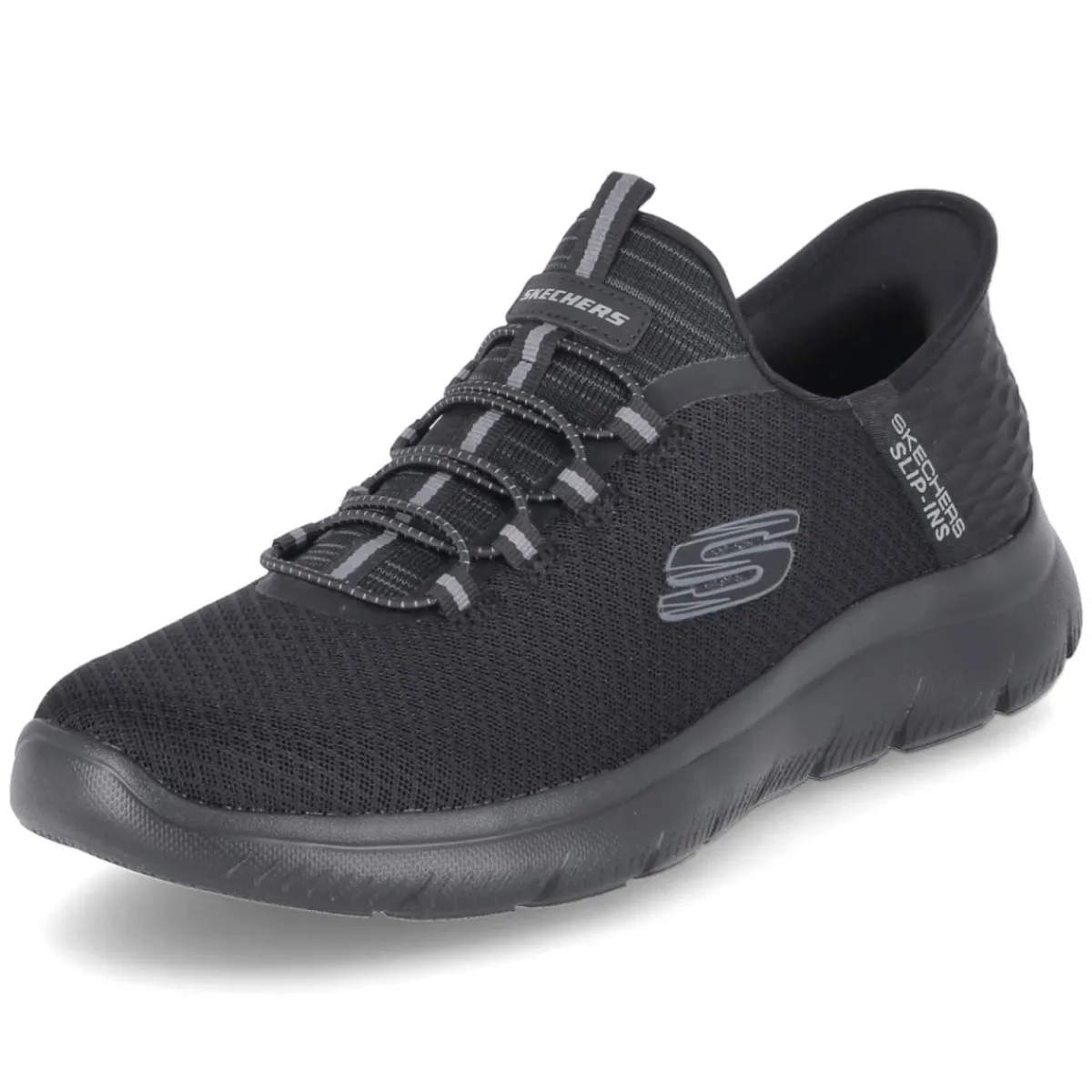 Der Skechers Slip-Ins SUMMITS vereint mühelosen Einstieg mit sportlichem Komfort. Das schwarze Obermaterial aus Textil liegt leicht am Fuß, die runde Spitze und das flexible Design sorgen für ein entspanntes Tragegefühl im Alltag. Dank bester Memory-Foam-Fußbettung passt sich die Decksohle aus Textil weich an und federt jeden Schritt. Das Modell fällt normal aus und kommt ganz ohne Verschluss aus – einfach hineinschlüpfen und losgehen. Vegane Materialien machen den Sneaker zu einer bewussten Wahl. Praktisch: Der Schuh ist maschinenwaschbar und damit schnell wieder frisch. Als vielseitiger Begleiter lässt sich das cleane Design von Freizeit bis Büro kombinieren und überzeugt durch zurückhaltende Ästhetik. Modetipp: Mit schwarzer Tech-Jogpants, weißem T‑Shirt und leichtem Overshirt entsteht ein moderner Monochrom-Look.