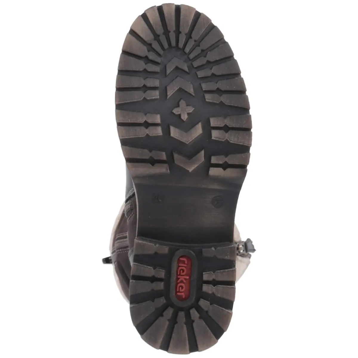 Der Damenstiefel von Rieker vereint wintertaugliche Funktion mit urbanem Stil. In tiefem Schwarz gehalten, schützt das wasserabweisende RiekerTEX mit wasserfestem Material-Mix zuverlässig vor Nässe, während das warme Futter behagliche Wärme spendet. Eine textile Decksohle sorgt für angenehmes Fußklima, die runde Schuhspitze und der 4 cm hohe Blockabsatz bieten entspannten Laufkomfort im Alltag. Der bequeme Reißverschlusseinstieg erleichtert das Anziehen; außen setzt ein Zierreißverschluss modische Akzente. Der dunkelbraune, leicht geraffte Schaft trifft auf eine beige Schaftkrempe aus Filz mit kleinem Elastikeinsatz, der Bewegungsfreiheit schafft. Stabilität liefern die verstärkte Ferse und die rutschfeste Laufsohle, das Obermaterial aus Textil und Synthetik zeigt sich pflegeleicht. Modetipp: zu Strickkleid, Wollmantel und dicken Rippstrümpfen kombinieren – für einen eleganten, wetterfesten City-Look.