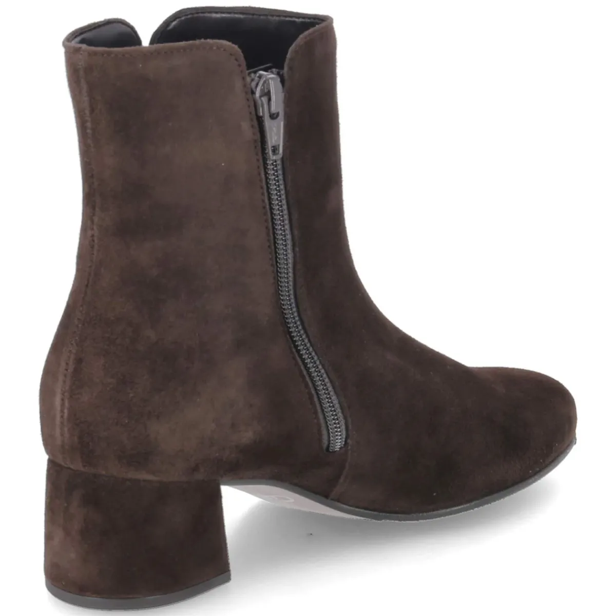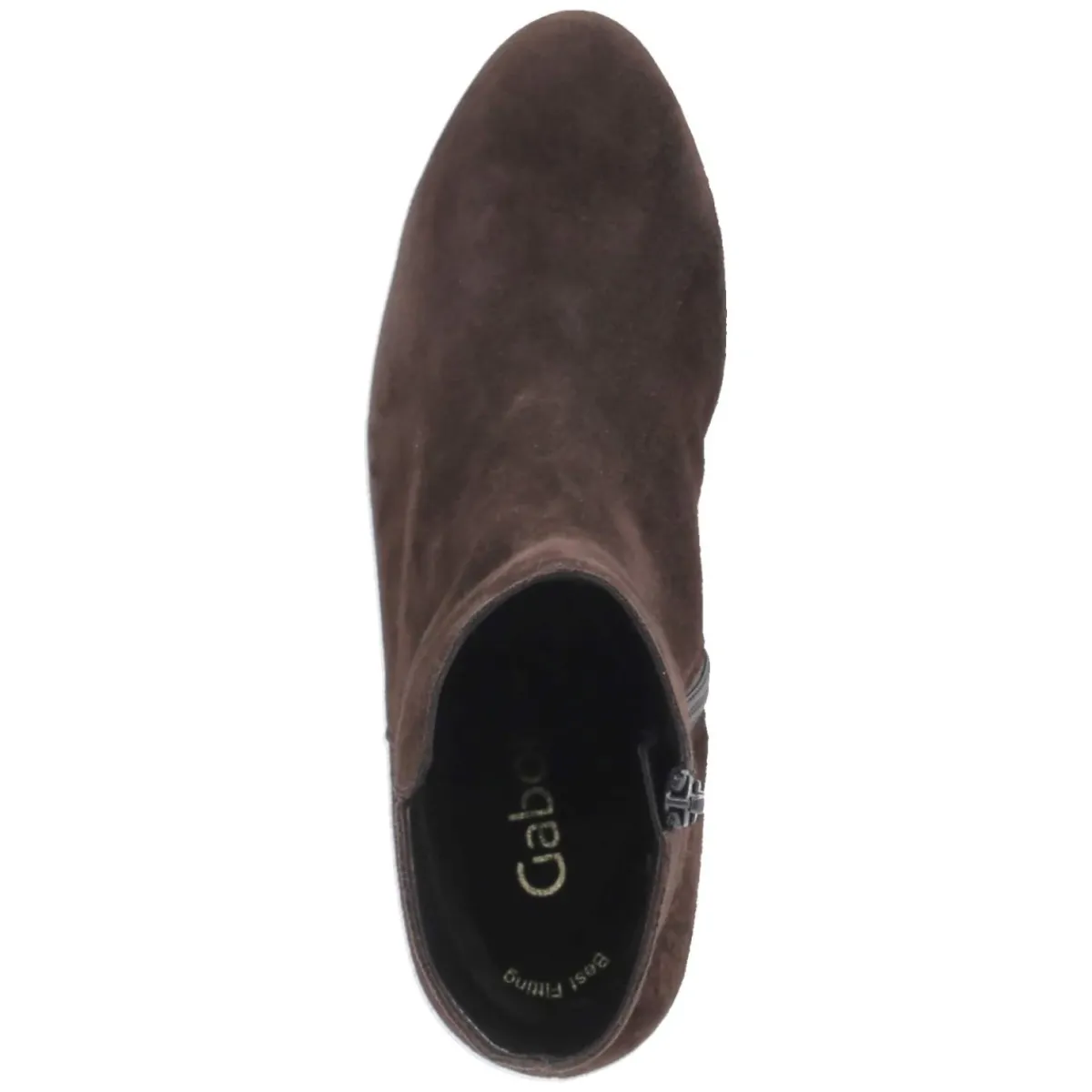 Diese dunkelbraunen Stiefeletten von Gabor vereinen klarliniges Design und Komfort im Alltag. Weiches Rauleder mit samtiger Oberfläche legt sich edel um den Fuß, die runde Spitze sorgt für eine harmonische Silhouette. Der 4,5 cm hohe Blockabsatz bietet stabilen Stand, während die flexible, griffige Laufsohle zuverlässigen Halt gibt. Ein bequemer Reißverschlußeinstieg erleichtert das An- und Ausziehen; ein kleiner, seitlicher Vent am Schaft setzt ein dezentes Detail. Die Textil-Decksohle schmiegt sich angenehm an. Schnitt fällt schmaler aus, daher im Zweifel eine Nummer größer bestellen. Vielseitig kombinierbar vom Büro bis zum Stadtbummel. Modetipp: Besonders modern wirkt das Modell zu verkürzten Straight-Jeans, Feinstrick in Creme und einem wolligen Mantel in Karamell.