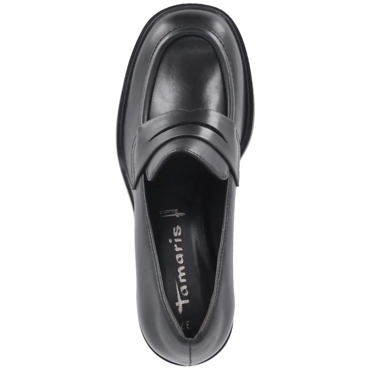 Der Trotteur von Tamaris verbindet edle Optik mit komfortabler Alltagstauglichkeit. Das schwarze Obermaterial aus Synthetik ist bewusst vegan gewählt und zeigt sich mit runder Schuhspitze, elegantem Zierriemen über dem Spann und klassischer Wulstnaht auf dem Schuhdeck. Der 6 cm hohe Blockabsatz sorgt für einen souveränen Stand, während das weich gepolsterte Fußbett und der Einstieg mit Fersenpolster angenehme Stunden auf den Beinen ermöglichen. Als praktischer Slipper kommt das Modell ohne Verschluss aus und fällt in der Größe normal aus. Die Synthetik-Decksohle rundet die pflegeleichte Konstruktion ab. Ob fürs Office oder den Abendtermin, dieser Damen-Schuh setzt dezente Statements und bleibt zugleich bequem. Modetipp: Besonders modern wirkt der Trotteur zu verkürzter Zigarettenhose und fließender Bluse; ein schmaler Gürtel in Schwarz greift die klare Linienführung stilsicher auf.