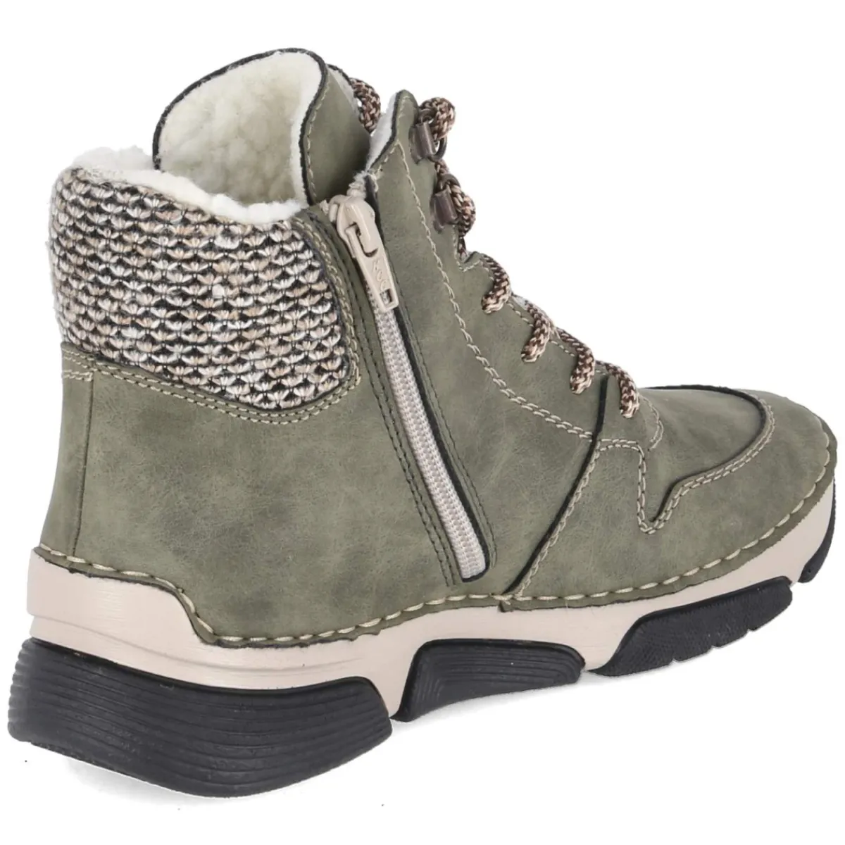 Der Winterboot von Rieker verbindet Funktion und Stil in einem souveränen Allrounder. Das grüne Obermaterial aus pflegeleichtem Kunstleder punktet mit unkomplizierter Reinigung, während das kuschlige Warm- und Teddyfutter verlässlich durch kalte Tage begleitet. Dank relaxtem Leichtgewicht und flexibler, griffiger Laufsohle bleibt der Schritt geschmeidig, die runde Spitze schafft angenehme Zehenfreiheit. Praktisch: die Kombination aus Schnürsenkeln und Reißverschluss für variablen Halt und schnelles An- und Ausziehen. Ein gepolsterter Einstieg erhöht den Komfort, verstärkte Zehen- und Fersenpartien geben Struktur und Schutz. Die Decksohle aus Synthetik ist robust, der Größenhinweis fällt normal aus. Modetipp: Zur satten Grünnuance wirken dunkelblaue Straight-Leg-Jeans, ein sandfarbener Steppmantel und cremefarbene Stricksocken, die dezent über dem Schaft hervorblitzen, besonders harmonisch.
