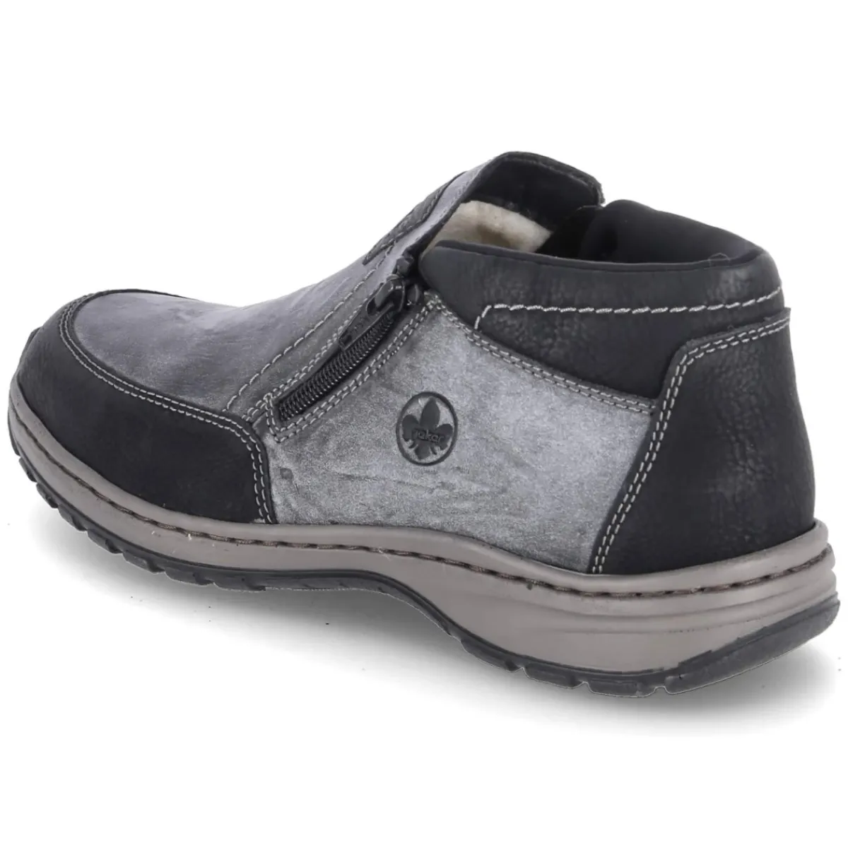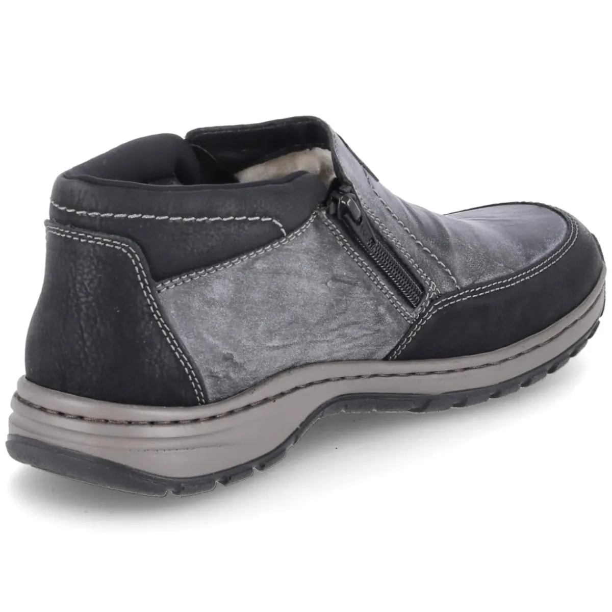 Der Winterschuh von Rieker in Grau mit melierter Optik vereint warme Funktion und dezentes Design für Herren. Das pflegeleichte Synthetik-Obermaterial hält dem Alltag stand, während das weiche Warmfutter zusammen mit der textilen Decksohle für behagliches Klima an kalten Tagen sorgt. Praktische Reißverschlüsse ermöglichen einen schnellen Einstieg und die runde Schuhspitze bietet komfortablen Zehenraum. Dank Wechselfußbett lässt sich die Passform flexibel anpassen, auch für individuelle Einlagen geeignet. Die Passform fällt normal aus und unterstützt ein natürliches Abrollen im Stadtalltag. Die dezente Farbgebung lässt sich vielseitig kombinieren und setzt auf Understatement, ohne auf Komfort zu verzichten. Modetipp: Besonders harmonisch wirkt das Modell zu dunkler Raw-Denim, grauem Wollmantel und grob gestricktem Schal; wertige Wollsocken in gedeckten Tönen runden den Look funktional und stilvoll ab.