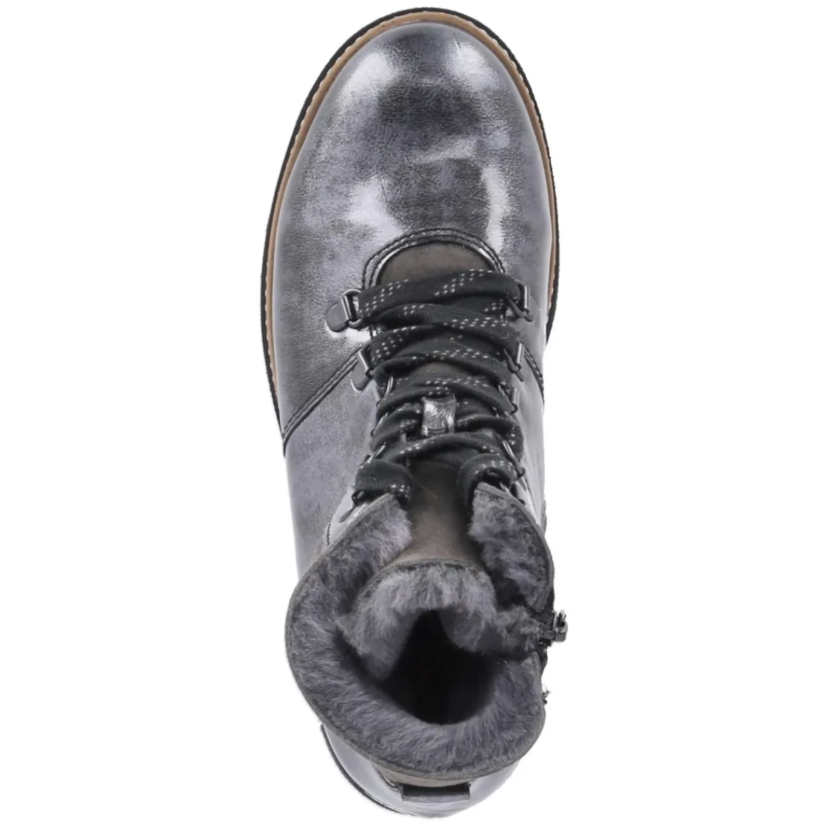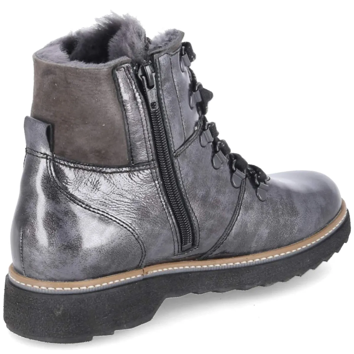 Die Winterstiefeletten HITOMI von Waldläufer verbinden eleganten metallischen Glanz mit zuverlässiger Wärme. Das graue Lackleder zeigt ein feines Metallic-Muster, das je nach Licht dezent schimmert, während ein weicher Schafteinstieg mit Lammfell und ein warmes Futter für gemütliche Momente an kalten Tagen sorgen. Der 3,5 cm hohe Blockabsatz gibt stabilen Halt, die runde Spitze und die textile Decksohle unterstützen ein angenehmes Tragegefühl. Dank Schnürung und Reißverschluss gelingt der Einstieg komfortabel, die verstärkte Ferse und das gepolsterte, herausnehmbare Fußbett steigern den Wohlfühlfaktor zusätzlich. Das Modell fällt schmaler aus und bietet mit Wechselfußbett praktische Flexibilität. Modetipp: Zu Wollmantel in Anthrazit, Strickkleid und blickdichter Strumpfhose entsteht ein urbaner Winter-Look; silberfarbene Accessoires greifen den metallischen Schimmer stilvoll auf.