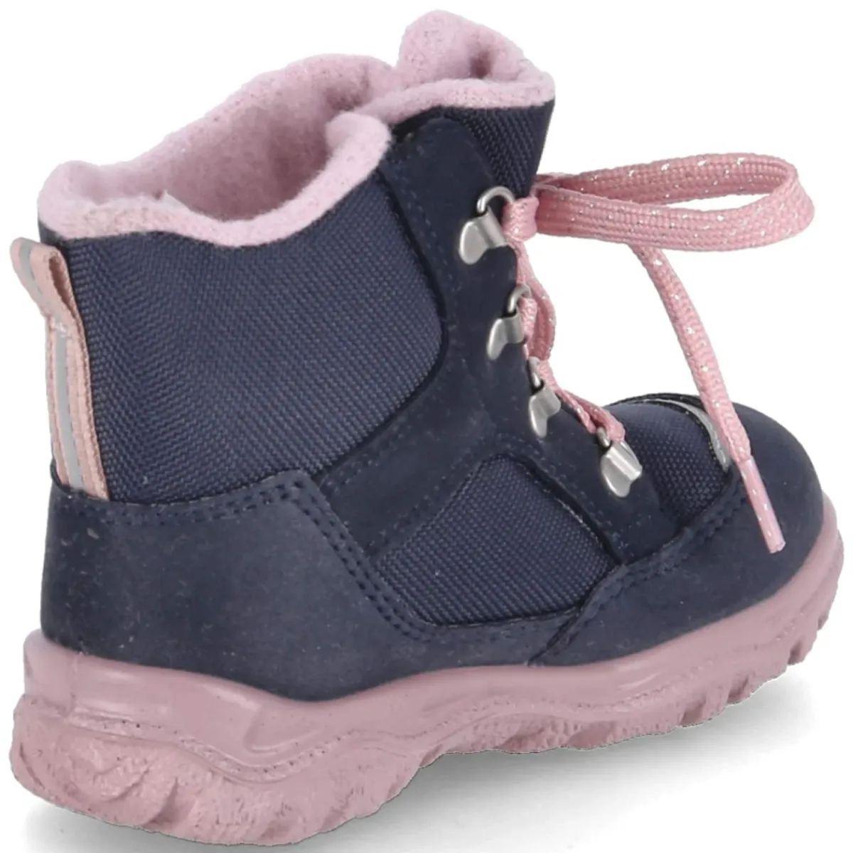 Der Superfit HUSKY1 zeigt, wie Winterstiefeletten für Kleinkinder zuverlässig wärmen und gleichzeitig leicht bleiben. Das Obermaterial aus Textil und Synthetik wird von einer Gore‑Tex Ausstattung ergänzt, die wasserfesten Schutz und Atmungsaktivität verbindet. Warmfutter und gepolsterter Einstieg umschließen den Fuß angenehm, die runde Spitze und Weite M bieten Bewegungsfreiheit. Die Schnürung mit rosa Glitzerschnürsenkeln erlaubt eine individuelle Anpassung, eine Anziehlasche erleichtert das Hineinschlüpfen. Reflektierende Details erhöhen die Sichtbarkeit in der Dämmerung, während die flexible, rutschhemmende Profillaufsohle auf winterlichen Wegen Halt gibt. Die herausnehmbare Textildecksohle unterstützt passgenauen Sitz und Pflege. In sattem Blau und mit normaler Passform eignet sich der HUSKY1 für Alltag und Abenteuer im Schnee. Modetipp: Mit Thermojeans, Strickmütze in Rosé und einer dunkelblauen Funktionsjacke entsteht ein stimmiger, wintertauglicher Look.