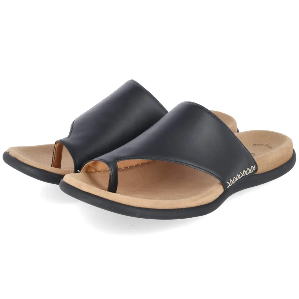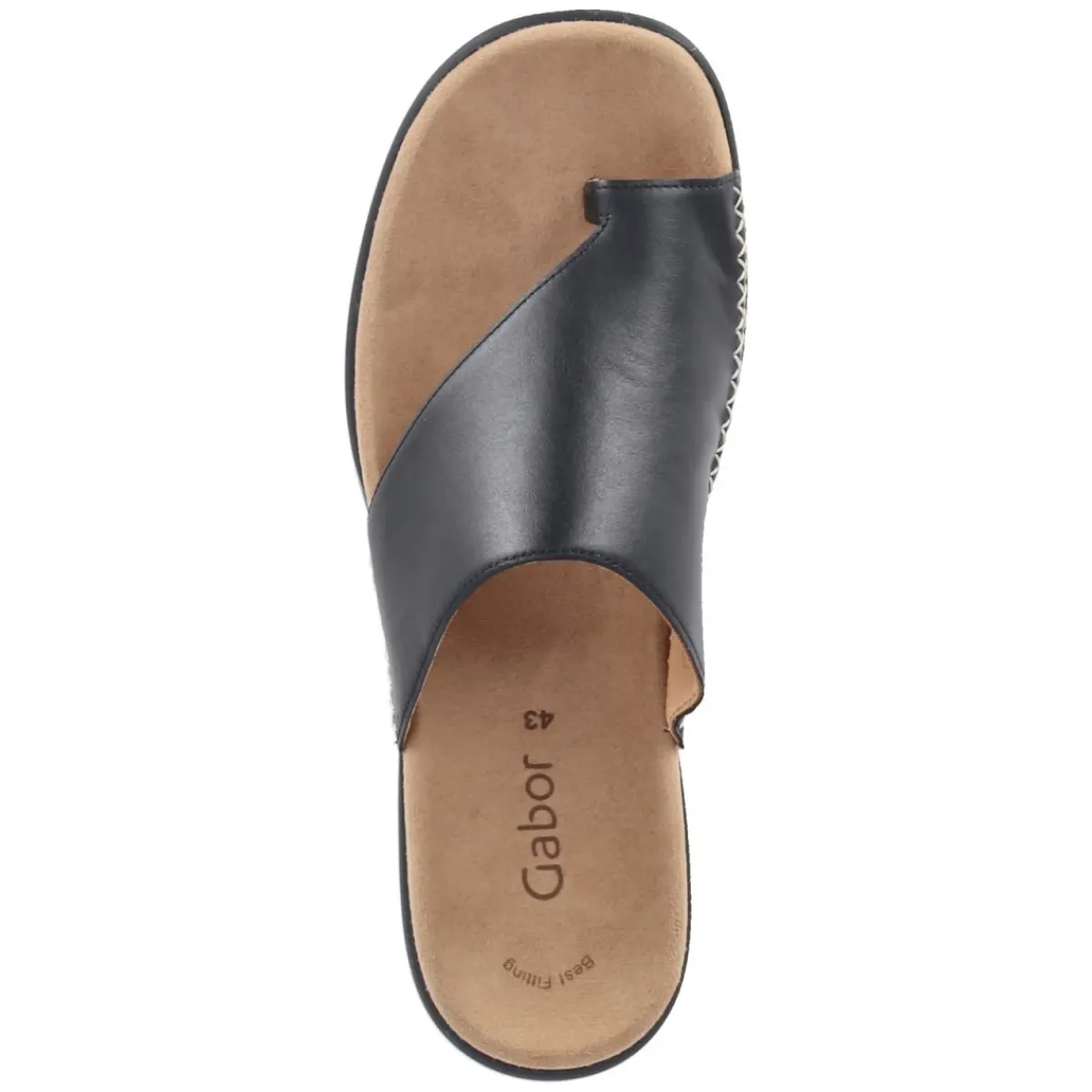 Der Zehentrenner von Gabor verbindet lässige Sommerleichtigkeit mit eleganter Zurückhaltung. Schwarzes Glattleder in langlebiger Qualität formt eine schmale Silhouette, die dank offenem Schnitt luftig bleibt und durch den seitlichen Kreuzstich eine feine, handwerkliche Note erhält. Die flexible, griffige Laufsohle sorgt auf Stadtpflaster wie auf Strandpromenaden für verlässlichen Halt, während das dämpfende, vorgeformte Fußbett zusammen mit der weichen Textildecksohle spürbaren Komfort über den ganzen Tag liefert. Ohne Verschluss gleitet der Fuß mühelos hinein, und die Passform fällt normal aus. Das elegante Design lässt sich vielseitig kombinieren, von fließenden Stoffen bis hin zu klarer Tailoring-Optik. Modetipp: Für einen modernen Mono-Look schwarze Leinenhose und tonige Accessoires wählen; ein zarter Goldreif setzt einen warmen Akzent zum kühlen Lederfinish.