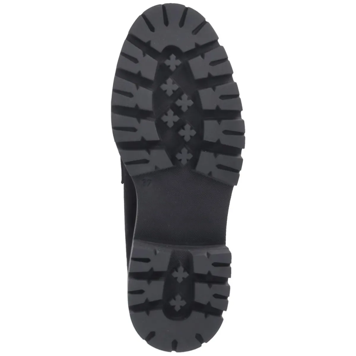 Kaerlek interpretiert den klassischen Damen-Loafer mit markantem Auftritt: Schwarzes Rauleder aus robustem Echtleder trifft auf einen 4,5 cm hohen Blockabsatz und eine starke Profilsohle, die sicheren Tritt und urbanen Charakter verleiht. Das rund zulaufende Blatt mit braunem Camouflageprint setzt einen raffinierten Kontrast, während der Zierriemen mit Quasten den Look elegant abrundet. Dank bequemem Fersenpolster, verstärkter Ferse und angenehm gepolsterter Decksohle aus Synthetik bleibt der Slip-on-Komfort ohne Verschluss den ganzen Tag erhalten. Die Passform fällt normal aus und bietet vielseitige Kombinationsmöglichkeiten vom Office bis zum Weekend. Modetipp: Mit verkürzter Anzughose und feiner Stricksocke entsteht ein kontemporärer Preppy-Style, der das Camouflage-Detail subtil in Szene setzt.