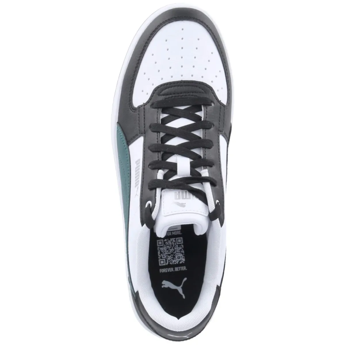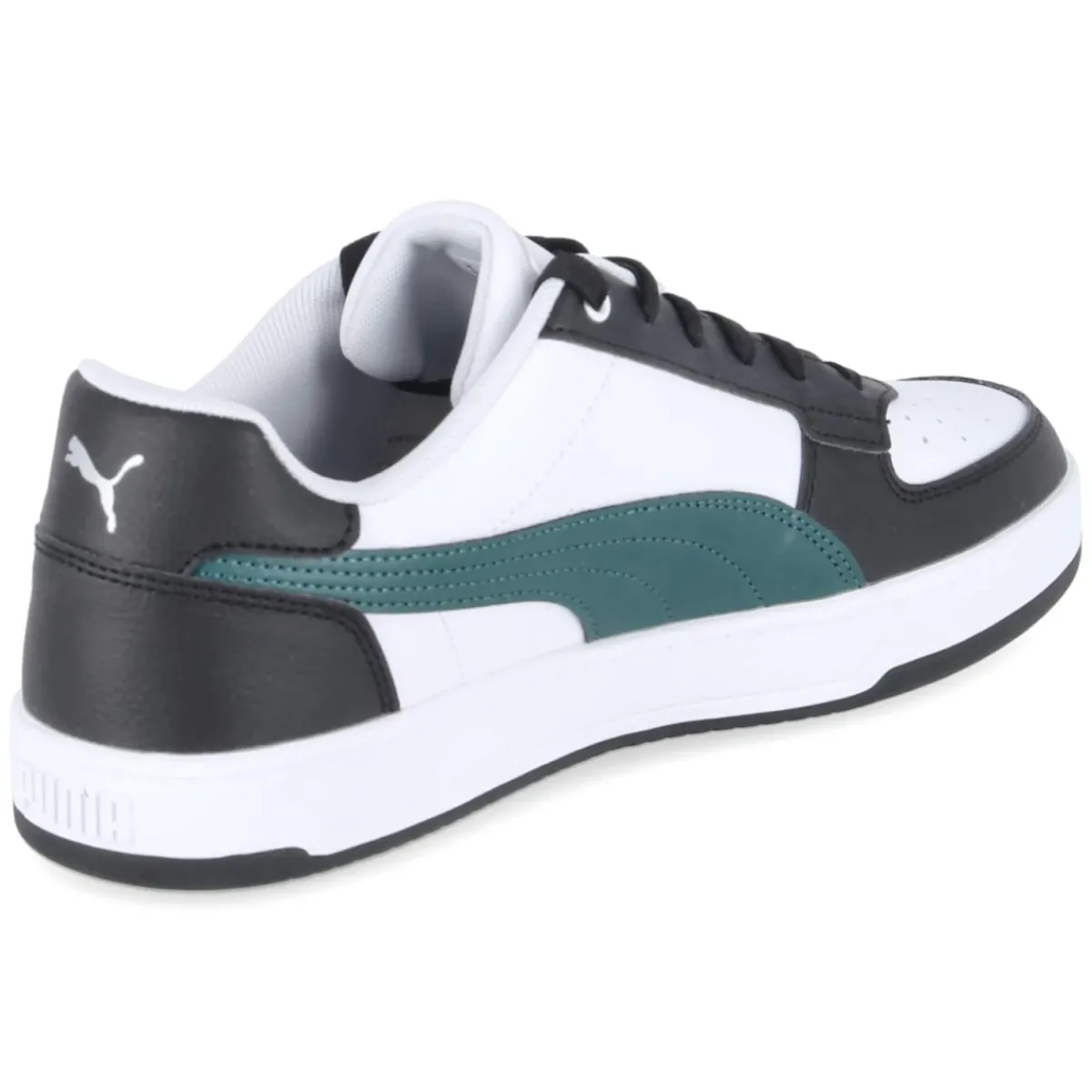 Der Low Sneaker CAVEN 2.0 von Puma verbindet cleanes Court-Design mit funktionalem Komfort. Das strahlend weiße Synthetik-Obermaterial ist besonders pflegeleicht, während der Formstrip in Dunkelgrün und silberne Markendetails sportliche Akzente setzen. Ein dezent gelochtes Schuhdeck fördert die Luftzirkulation, der gut gepolsterte Einstieg erhöht den Tragekomfort im Alltag. Verstärkte Zonen an Zehen und Ferse in Schwarz sorgen für Stabilität, die rutschfeste Laufsohle für verlässlichen Grip. Die textile Decksohle und das komfortable, herausnehmbare Wechselfußbett unterstützen ein angenehm gedämpftes Laufgefühl. Der Sneaker fällt schmaler aus und bietet dadurch eine präzisere Passform bei schlankeren Füßen. Modetipp: Mit weiter Anzughose, weißem T-Shirt und dunkelgrünem Blouson entsteht ein moderner City-Look, der die Farbe des Formstrips gekonnt aufgreift.