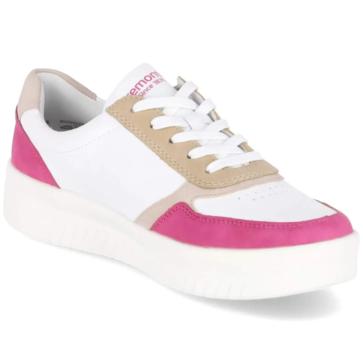 Der Low Sneaker von Remonte verbindet sportliche Leichtigkeit mit urbanem Chic. Glattes Leder prägt das Weiß des Obermaterials, das durch beige, orange und pinke Elemente frisch akzentuiert wird. Der moderne Material-Mix zeigt sich in dezent gelochtem Zehenbereich und verstärkter Zehen- sowie Fersenzone, während die runde Spitze für angenehmen Platz sorgt. Ein gepolsterter Einstieg und die flexible Cupsohle erhöhen den Tragekomfort im Alltag. Praktisch: Schnürung für passgenauen Halt und zusätzlicher Reißverschluss für schnelles An- und Ausziehen. Innen punktet eine Textildecksohle und das weich gepolsterte, herausnehmbare Wechselfußbett – ideal für eigene Einlagen. Der Sneaker fällt normal aus und trägt gelabelte Details. Modetipp: Zu Cropped-Mom-Jeans und leichtem Trench entsteht ein lässiger City-Look; wer es femininer mag, kombiniert ein cremefarbenes Midikleid und greift die Farbakzente mit Socken oder Tasche subtil auf.