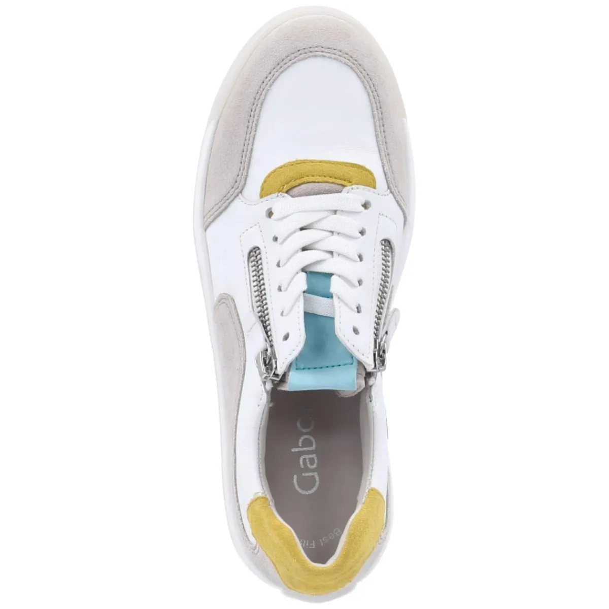 Der Low Sneaker von Gabor bringt zeitlose Frische in den Alltag: strahlendes Weiß trifft auf ein geschmeidiges Obermaterial aus Leder und eine runde Silhouette mit verstärktem Zehen- und Fersenbereich. Schnürsenkel und zusätzlicher Reißverschluss sorgen für variable Anpassung und einen unkomplizierten Einstieg, während der leicht gepolsterte Schaftrand Komfort verspricht. Das gepolsterte Wechselfußbett besteht aus recycelten Materialien und unterstreicht den zum Teil recycelten, umweltfreundlichen und nachhaltig gedachten Aufbau. Eine flexible, griffige, rutschhemmende Laufsohle gibt sicheren Halt, gelbe und blaue Highlights setzen subtile Farbakzente. Die Passform fällt normal aus, die Decksohle ist aus Leder gefertigt. Modetipp: Besonders modern wirkt das Modell zu Cropped-Jeans in Hellblau und gestreiftem Hemd, dazu eine leichte Trench-Jacke für einen frischen City-Look.