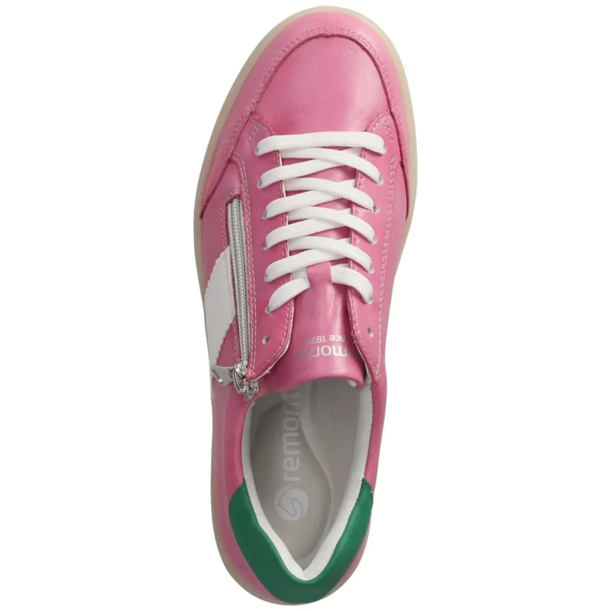Der Low Sneaker LIZ HURLEY von Remonte verbindet urbanen Stil mit durchdachtem Komfort. Das atmungsaktive Glattleder in frischem Pink trifft auf eine runde Spitze und eine verstärkte Ferse in kontrastierendem Grün; ein weißfarbener Zierstreifen akzentuiert die sportive Linie. Für bequemes An- und Ausziehen sorgt die Kombination aus Schnürung und zusätzlichem Reißverschluss, während der gepolsterte Einstieg und das komfortable, gepolsterte Wechselfußbett lang anhaltende Bequemlichkeit bieten. Die textile Decksohle schmiegt sich angenehm an, der verstärkte Zehenbereich schützt im Alltag. Eine flexible, rutschhemmende Laufsohle gewährleistet sicheren Halt auf verschiedensten Untergründen. Der Sneaker fällt größengetreu aus und eignet sich damit ideal für den täglichen Einsatz. Modetipp: Besonders stimmig zu heller Denim und einem leichten Stricktop in Pastelltönen.