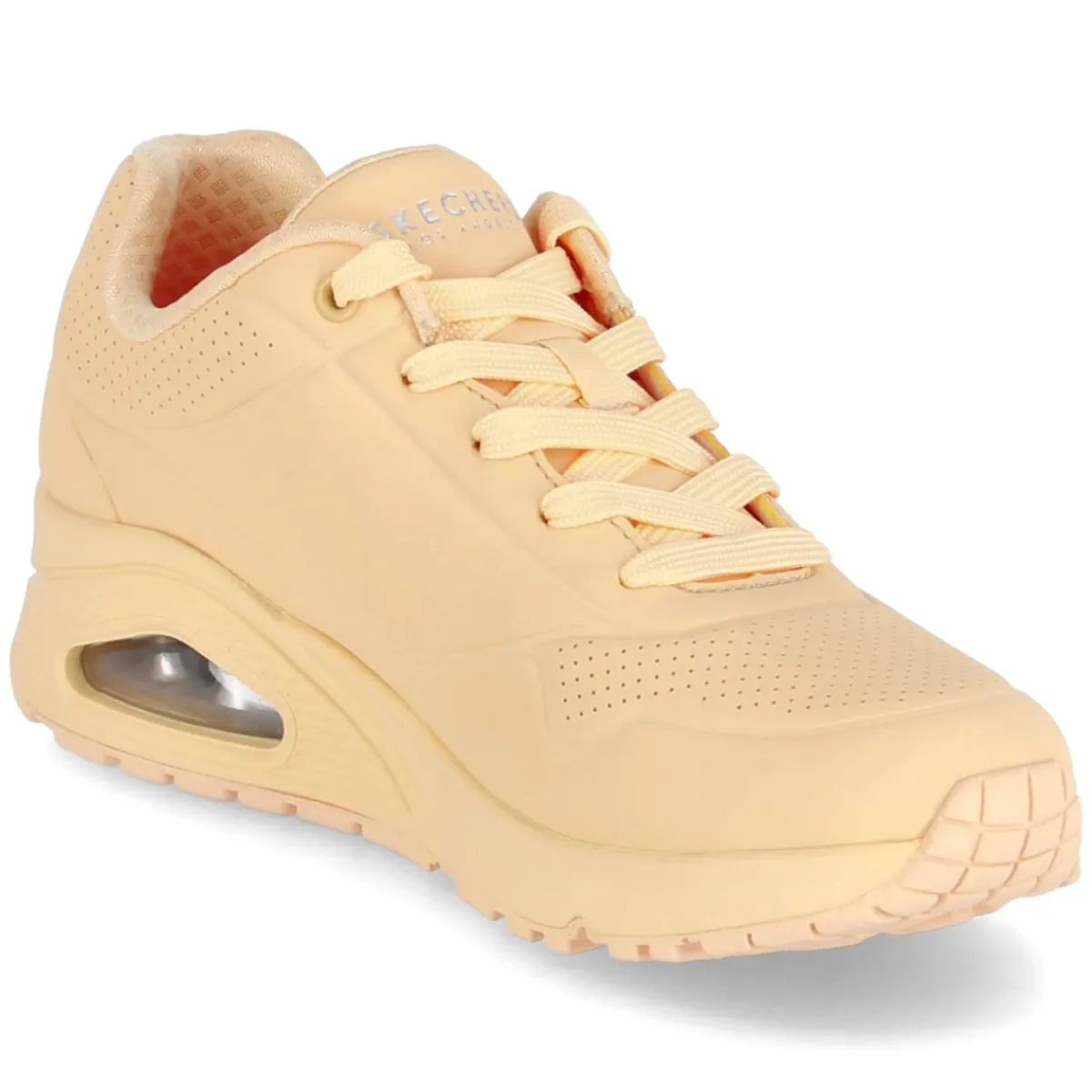 Der Skechers Low Sneaker UNO STAND ON AIR zeigt eine moderne Silhouette in sattem Orange und setzt mit dynamischen Prägungen sowie markanten Markendetails klare Statements. Das pflegeleichte Synthetik-Obermaterial überzeugt im Alltag, während die runde Schuhspitze und der gepolsterte Einstieg für ein angenehmes Tragegefühl sorgen. Die beste Memory-Foam-Fußbettung passt sich dem Fuß an und harmoniert mit der textilen Decksohle zu spürbarer Weichheit. Stabilität schaffen der verstärkte Zehen- und Fersenbereich, die rutschhemmende Profilsohle und das Sichtfenster in der Ferse, das die dämpfende Technologie unterstreicht. Der Schnürverschluss ermöglicht eine verlässliche Passform, die normal ausfällt und damit unkompliziert tragbar ist. Modetipp: Besonders stimmig wirkt der Sneaker zu heller Cropped-Denim und einer sportiven Bomberjacke; ein Feinstrick-Top in Offwhite greift die frischen Akzente elegant auf.