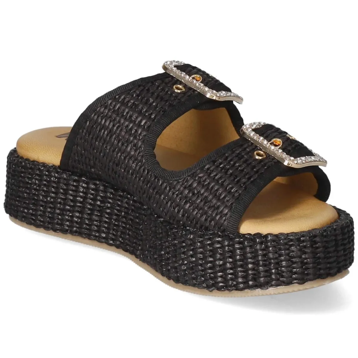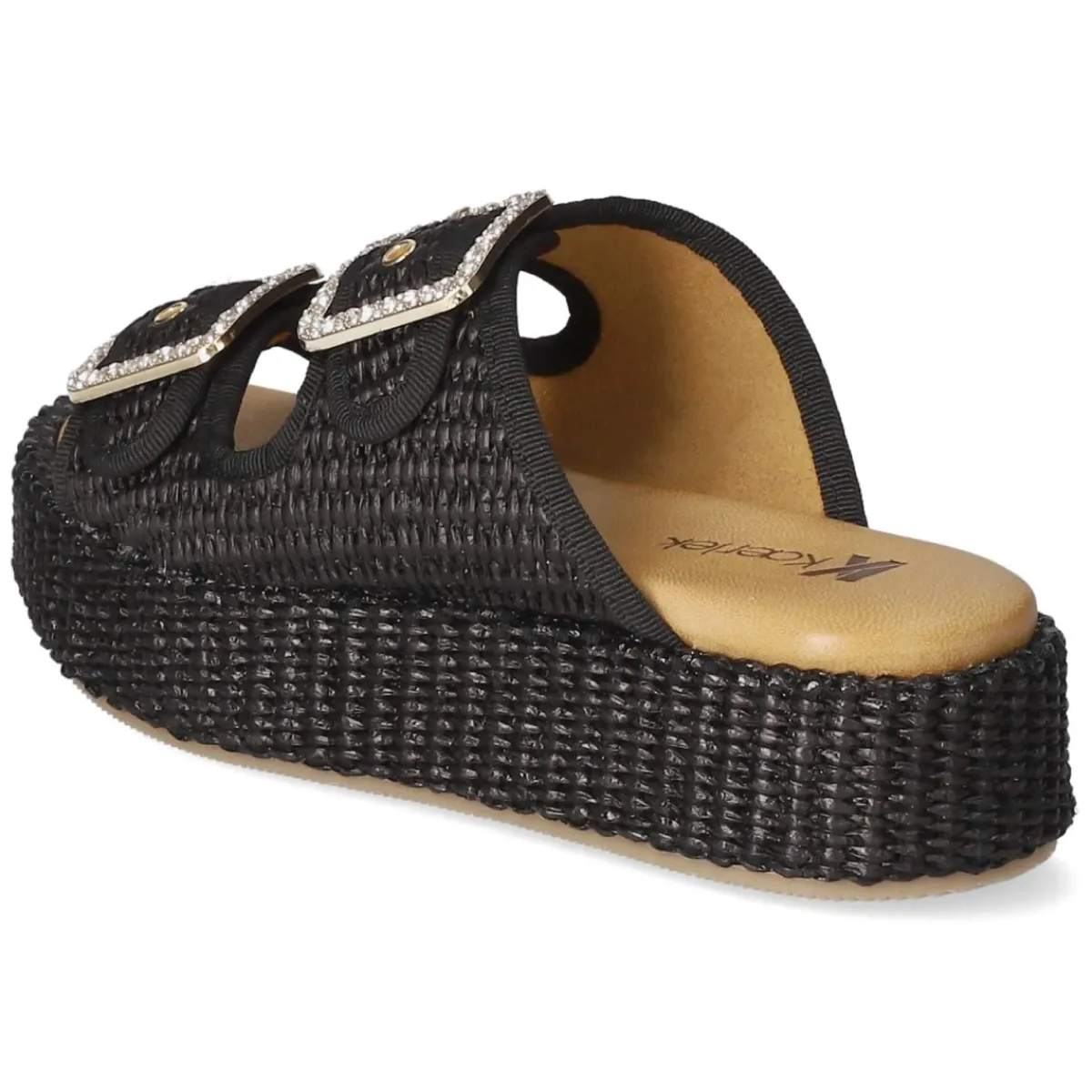 Pantoletten NERO von Kaerlek verbinden moderne Optik mit komfortabler Konstruktion. Das schwarze Modell setzt auf eine 4,5 cm hohe Plateau-Absatzform, die die Silhouette dezent streckt und dank breiter Auflagefläche stabil wirkt. Zwei goldfarbene Schnallen mit funkelnden Schmucksteinen verleihen Glamour; Details in Sisaloptik bringen sommerliche Struktur. Ein modern designtes Obermaterial aus Synthetik trifft auf eine Decksohle aus Leder, während das weich gepolsterte Fußbett angenehmen Halt schenkt. Die offene Schuhspitze unterstreicht die luftige Anmutung, der verstellbare Schnallenverschluss sorgt für passgenauen Sitz. Das Modell für Damen fällt normal aus und überzeugt im Alltag ebenso wie abends. Modetipp: Besonders edel wirkt die Pantolette zu einem monochromen Schwarz-Look mit goldenen Accessoires oder zu Raw-Denim und weißem Oversize-Hemd.