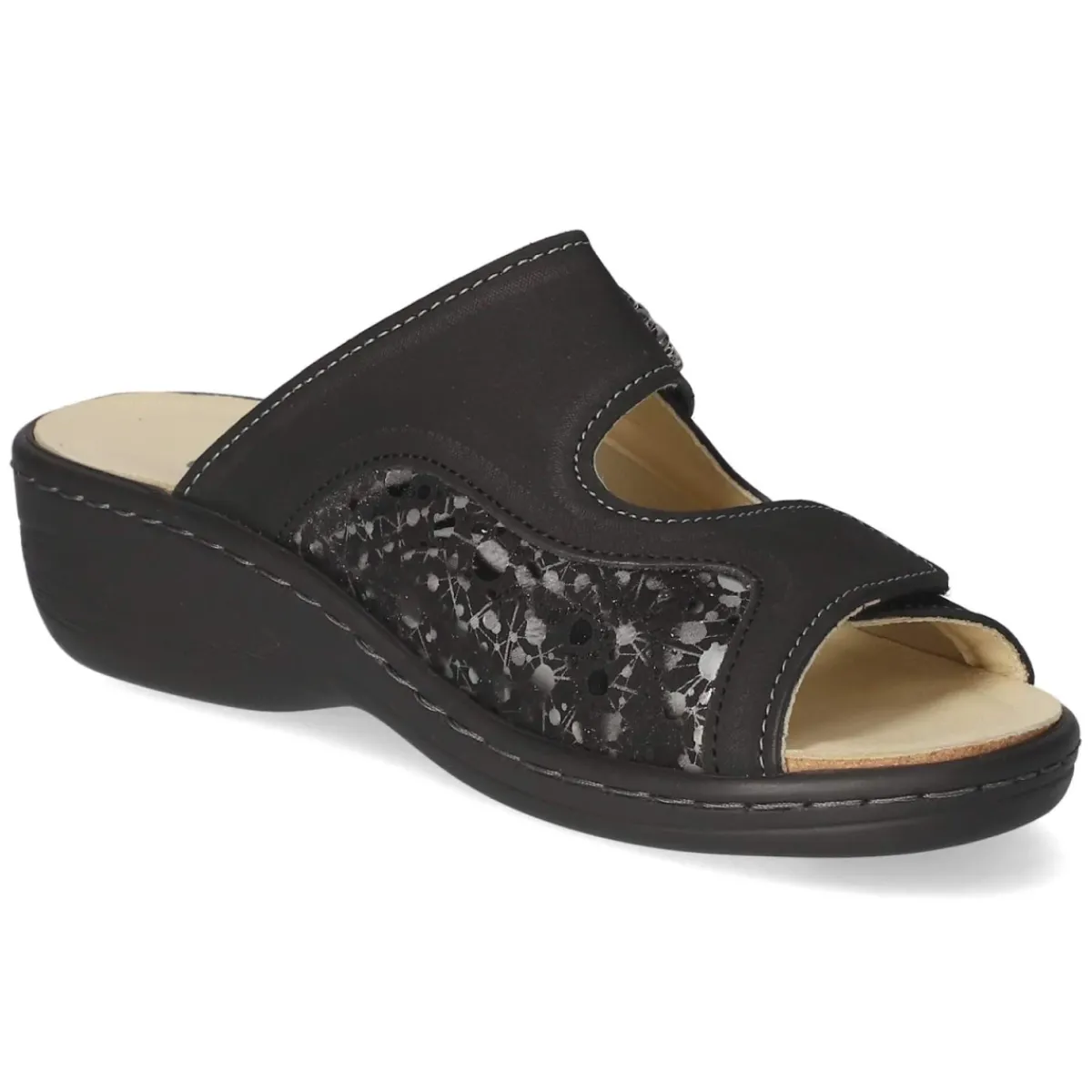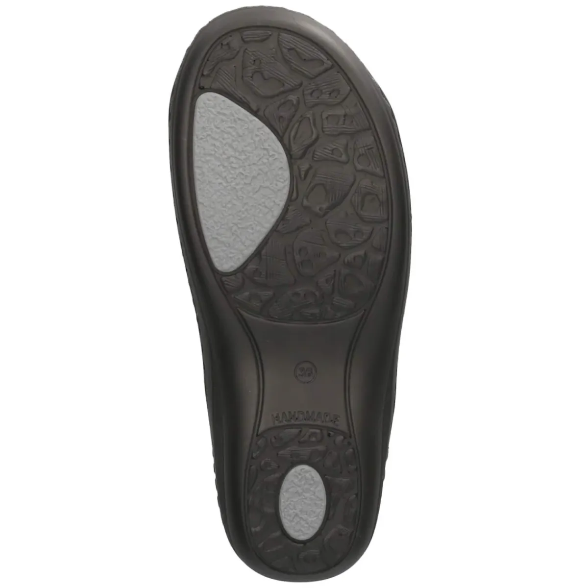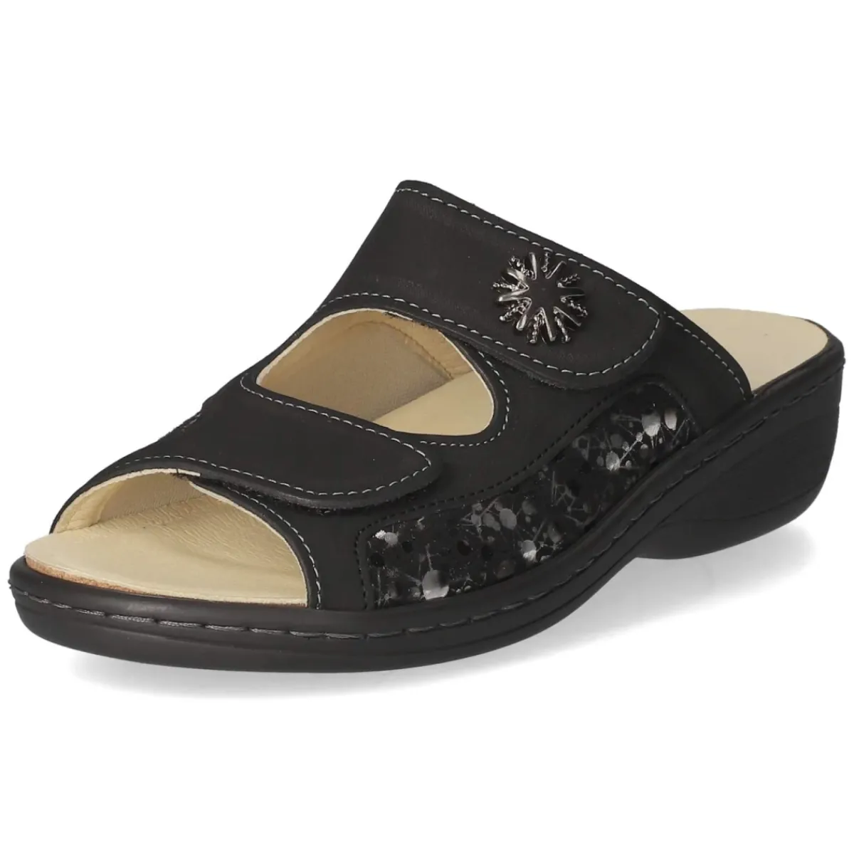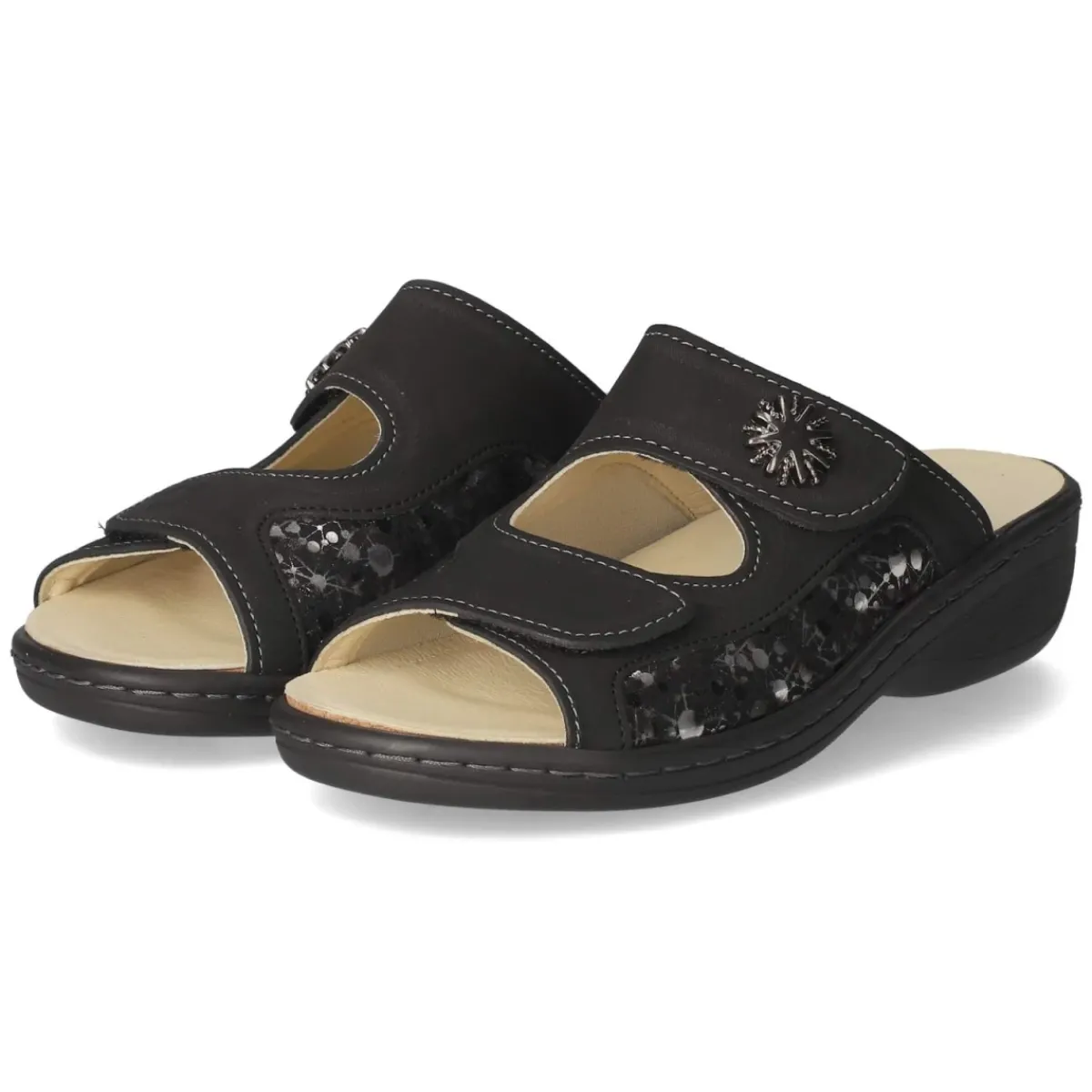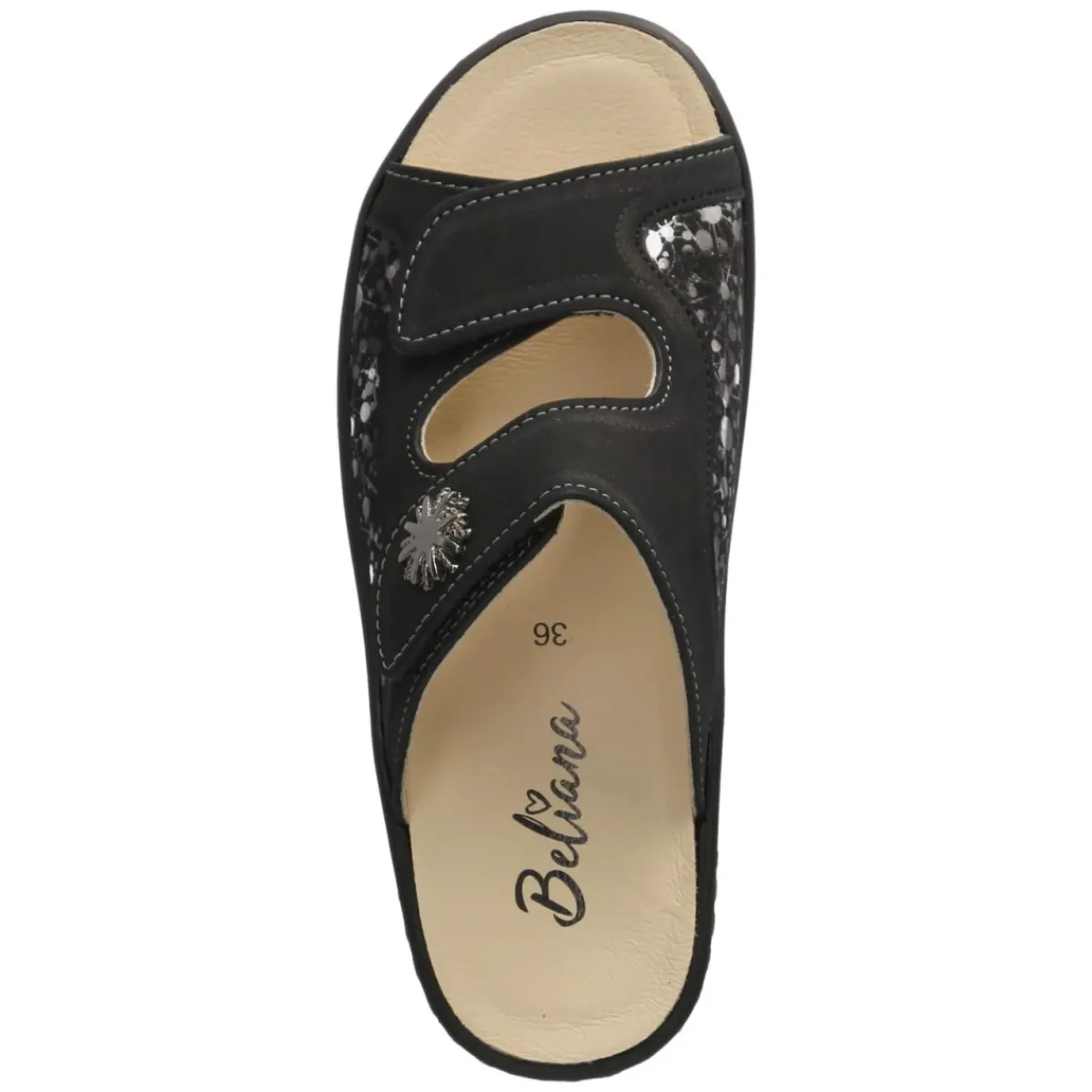 Die Pantoletten von Beliana setzen auf zeitloses Design und langanhaltenden Komfort. Obermaterial aus robustem Echtleder in Kombination mit textilem Einsatz verleiht dem schwarzen Modell Struktur und Strapazierfähigkeit, die Decksohle aus Leder sorgt für ein angenehmes Fußklima. Praktische Klettverschlüsse erlauben präzise Anpassung an den Spann, während das komfortable Wechselfußbett bei Bedarf gegen eigene Einlagen getauscht werden kann. Die offene Schuhspitze bringt Leichtigkeit in warme Tage, die flexible Sohle begleitet mühelos durch Alltag und Reise. Fällt größengetreu aus und eignet sich für erwachsene Damen, die Wert auf Qualität legen. Modetipp: Mit luftiger Leinenhose und fließender Bluse entsteht ein lässig-eleganter Sommerlook; ein schwarzer Gürtel und dezenter Goldschmuck greifen die Farbe stilvoll auf.