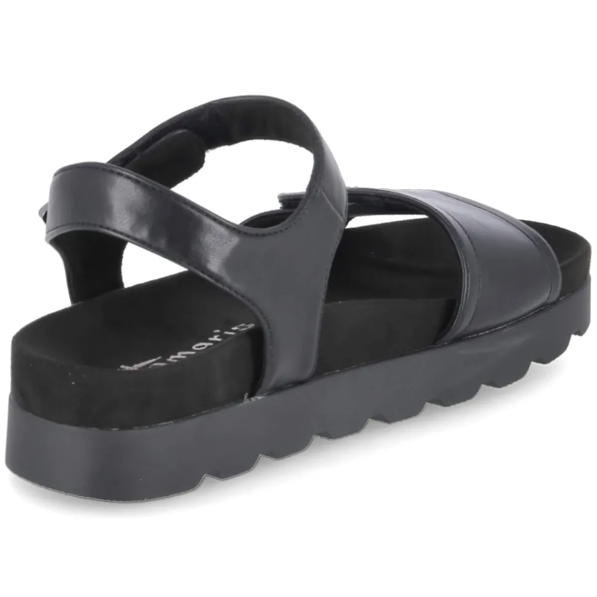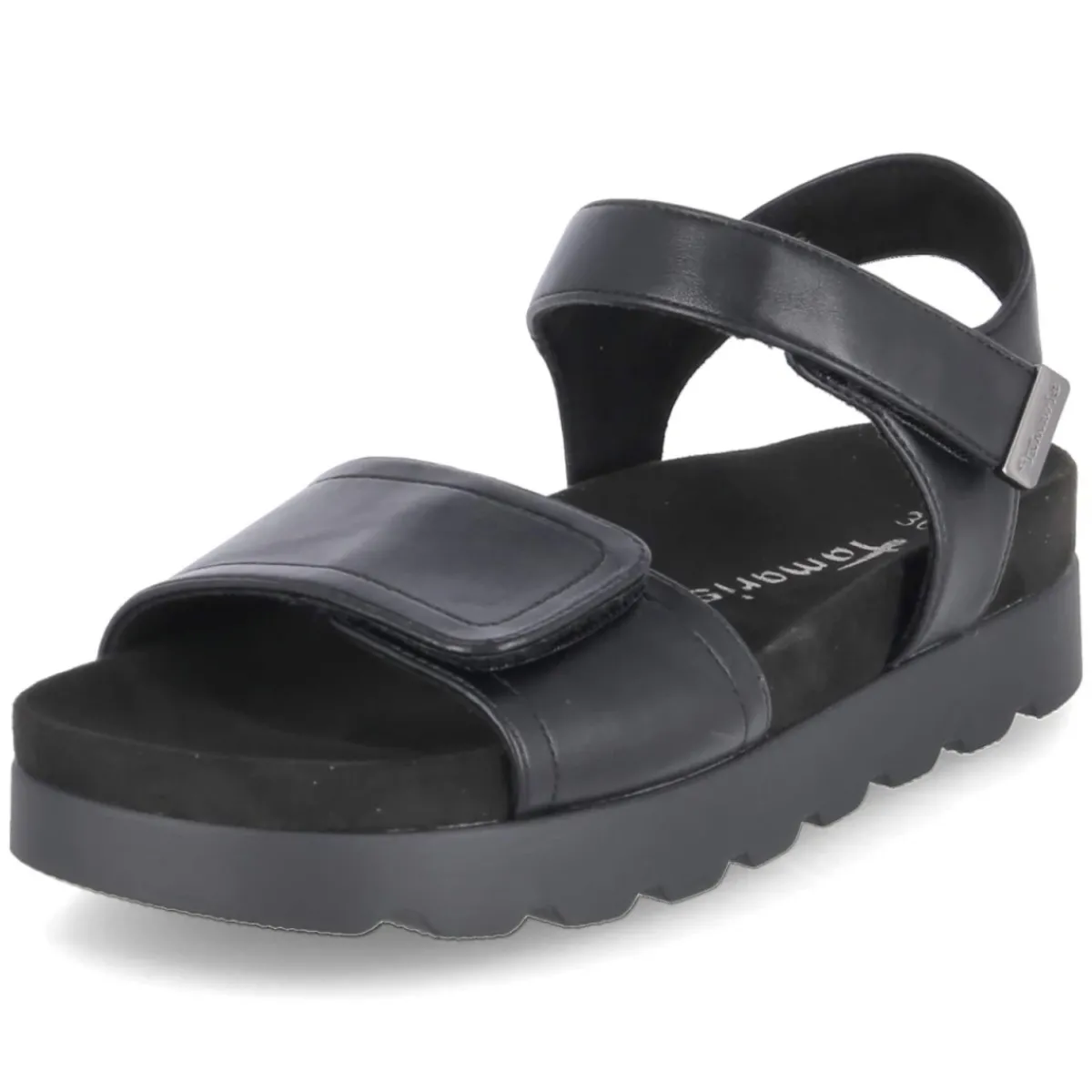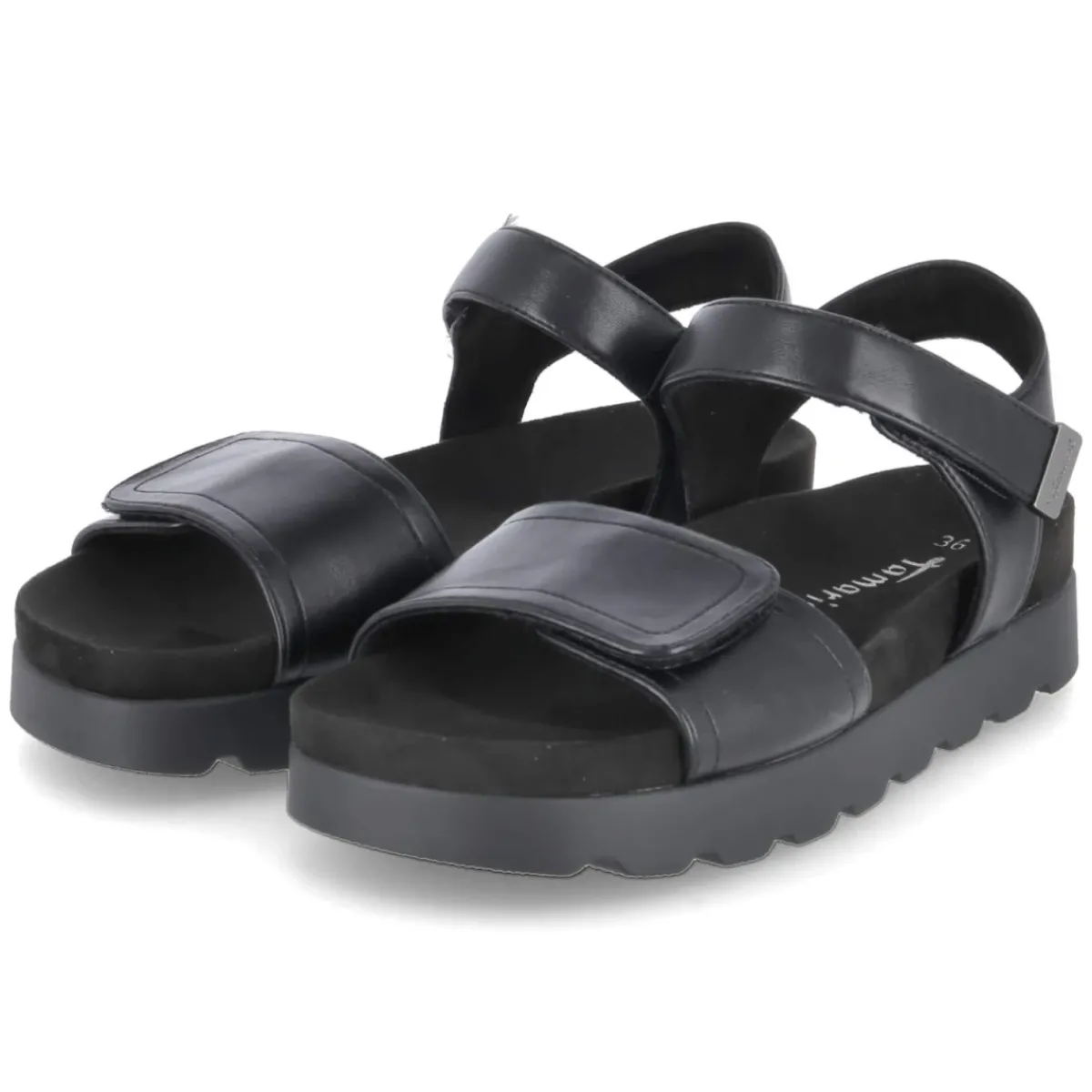 Schwarze Sandalen von Tamaris, die Alltagstauglichkeit und schlichte Eleganz vereinen. Das pflegeleichte Obermaterial aus Synthetik zeigt eine glatte Oberfläche, die sich unkompliziert reinigen lässt. Offene Schuhspitze und praktische Klettverschlüsse bieten sommerliche Leichtigkeit und eine individuell anpassbare Passform. Die vorgeformte Decksohle aus Textil schmiegt sich angenehm an, während das gepolsterte, vorgeformte Fußbett entspanntes Gehen über Stunden unterstützt. Eine stabile Laufsohle mit leichtem Profil sorgt für verlässlichen Grip auf städtischen Wegen. Das Modell fällt normal aus und integriert sich mühelos in vielseitige Looks – von casual bis smart. Modetipp: In Kombination mit einem fließenden Midikleid und einer leichten Jeansjacke entsteht ein moderner City-Look, der sich mit einer kleinen Umhängetasche und filigranem Schmuck stilvoll abrunden lässt.
