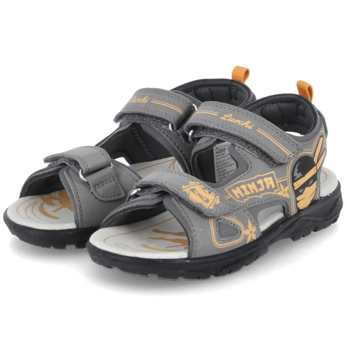 Die Sandalen KINJA von Lurchi bringen mit grauem Obermaterial aus Textil und Synthetik und einem orangen Ninja-Print Schwung in sommerliche Kinder-Outfits. Der moderne Material-Mix liegt leicht am Fuß, das weiche Lining und ein dämpfendes Fußbett steigern den Tragekomfort vom ersten Schritt an. Zwei praktische Klettverschlüsse und eine Anziehlasche erleichtern das Handling, während die offene Schuhspitze luftige Frische bietet. Die sehr flexible Profilsohle sorgt für gute Trittsicherheit auf Spielplatz, Schulweg und im Urlaub. Dank Weite W haben auch kräftigere Füße ausreichend Platz, gleichzeitig fällt das Modell insgesamt normal aus. Die bedruckte Optik bleibt alltagstauglich und macht Lust auf Bewegung. Modetipp: Zu Bermudas in Grau oder Schwarz und einem T‑Shirt mit orangenen Akzenten entsteht ein harmonischer Look; leichte Sportsocken oder barfuß funktionieren gleichermaßen.