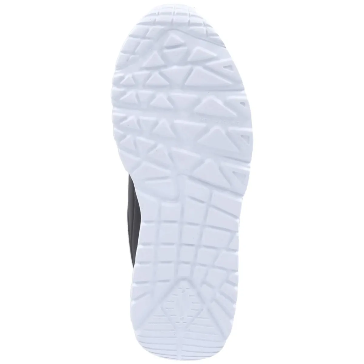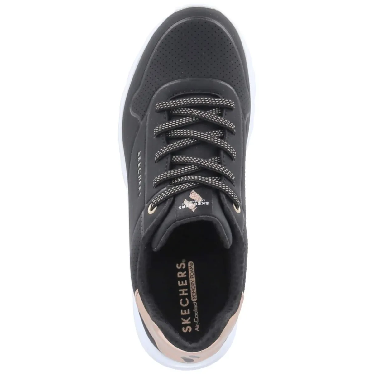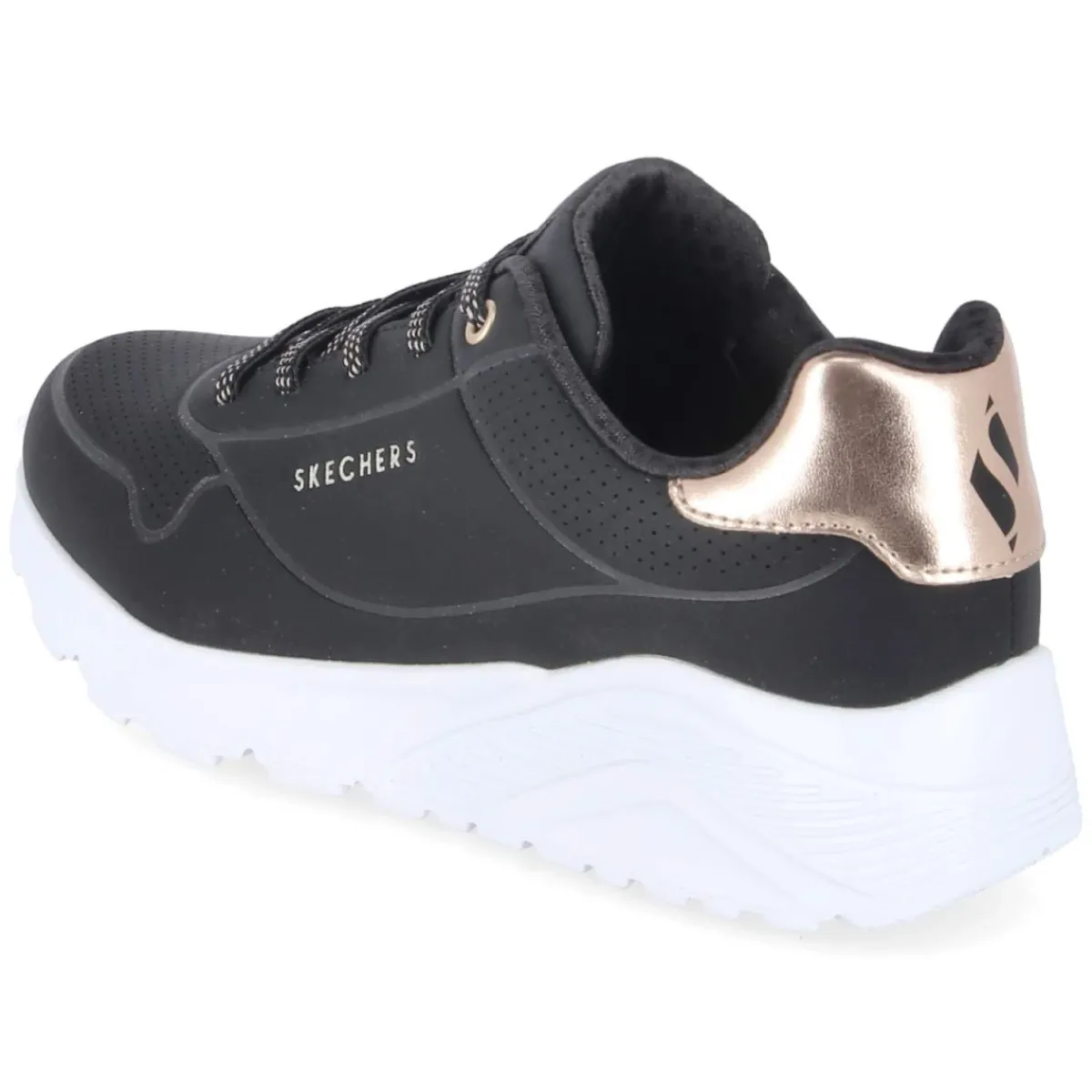 Der Skechers Sneaker UNO LITE METALLIC MODE verbindet kindgerechten Komfort mit moderner Optik. Das schwarze Obermaterial aus Synthetik zeigt dynamische Prägungen, feine Lochungen im Zehenbereich und eine Fersenklappe in goldener Metalloptik, die für einen edlen Akzent sorgt. Ohne klassische Schnürung gleitet der Fuß dank Elastikband in Schnüroptik schnell hinein, der gepolsterte Einstieg und die runde Spitze erhöhen den Tragekomfort. Die beste Memory-Foam-Fußbettung schmiegt sich weich an, die textile Decksohle bleibt angenehm auf der Haut. Eine flexible, rutschfeste Laufsohle gibt sicheren Halt auf dem Schulhof, gleichzeitig bleibt das Modell als relaxtes Leichtgewicht den ganzen Tag angenehm. Waschmaschinengeeignet für unkomplizierte Pflege, die Passform fällt normal aus. Modetipp: Besonders stimmig zu schwarzen Jogpants und einem Hoodie mit goldfarbenen Details am Rucksack oder Haarband.