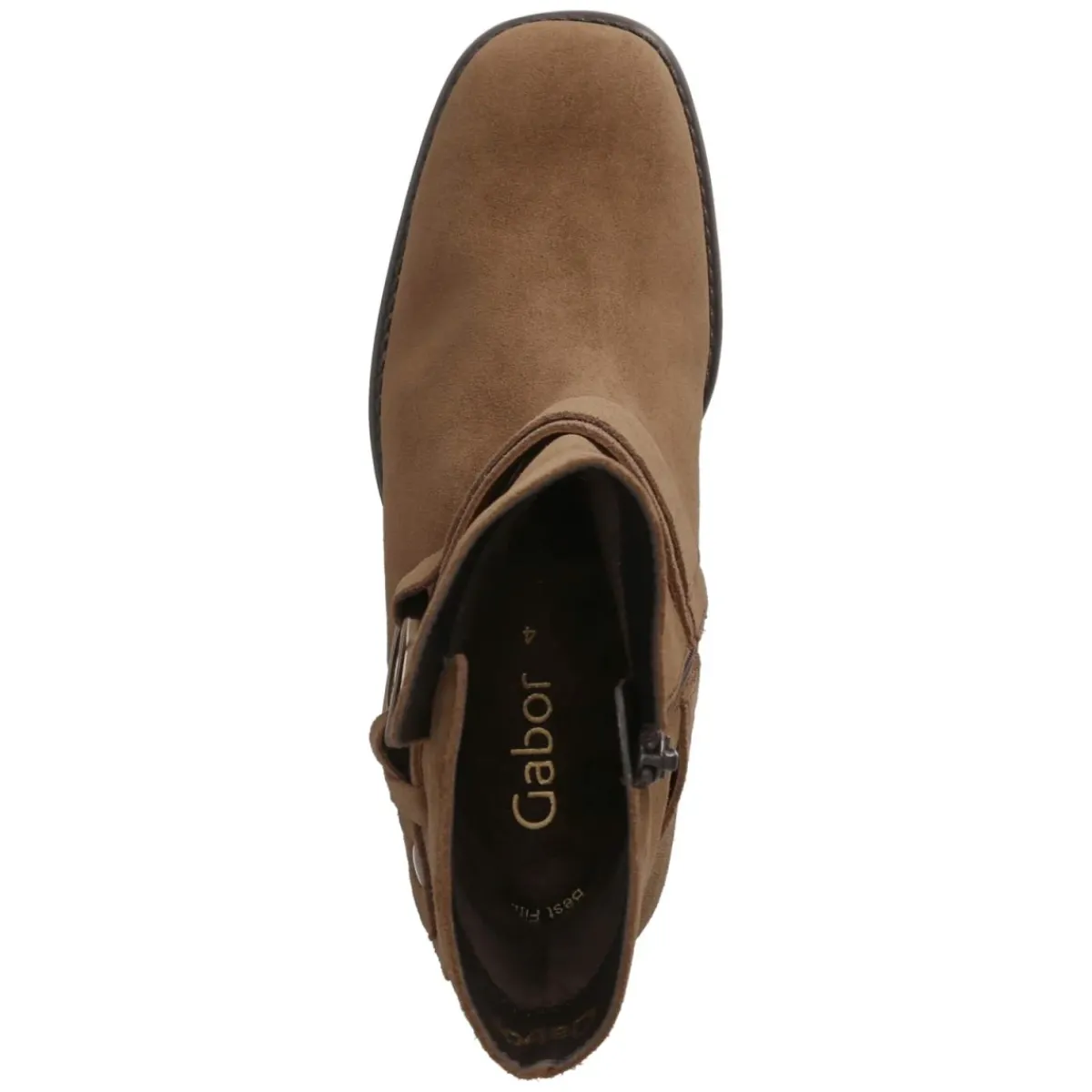 Die braunen Damen-Stiefeletten von Gabor verbinden zeitlosen Chic mit spürbarem Komfort. Weiches Rauleder aus atmungsaktivem Echtleder umschließt den Fuß, die runde Spitze bietet Bewegungsfreiheit. Der 4,5 cm hohe Blockabsatz sorgt für trittsicheren Stand, unterstützt von einer flexiblen, rutschfesten Laufsohle und einer verstärkten Ferse. Ein bequemer Reißverschlusseinstieg erleichtert das An- und Ausziehen. Innen verwöhnt ein gepolstertes, herausnehmbares Fußbett mit textiler Decksohle, ideal für eigene Einlagen. Ein Zierreifen mit goldenem Ring setzt einen dezenten Akzent. Das Modell fällt normal aus und begleitet souverän durch Alltag und Office. Modetipp: Zu fließender Culotte und Feinstrick wirkt das Braun besonders edel; goldene Accessoires greifen den Ring auf und runden den Look harmonisch ab.
