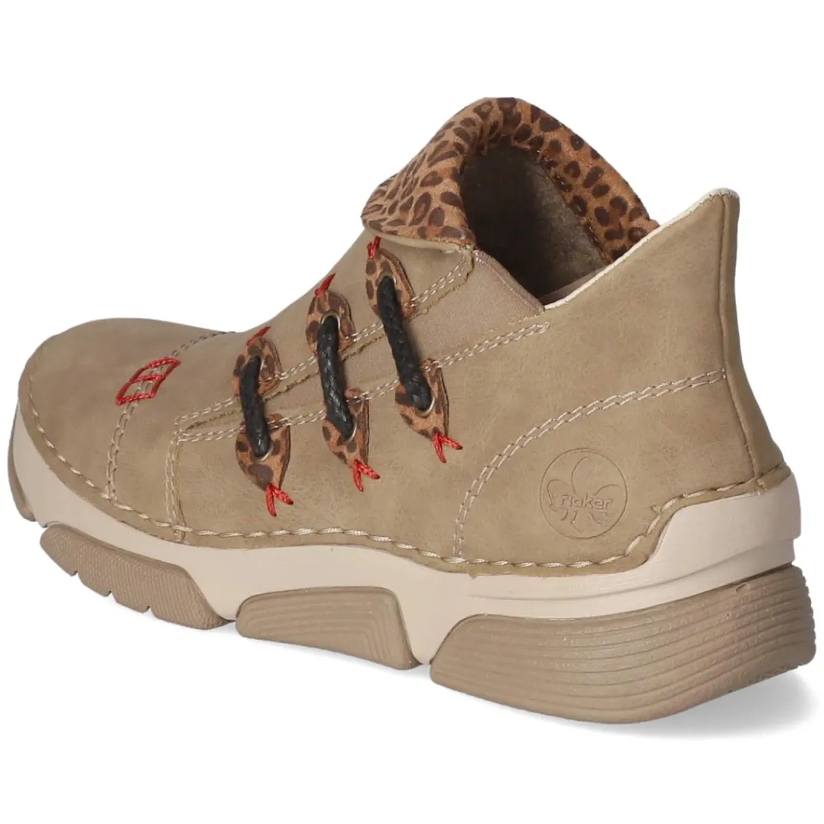 Diese beige Damen-Stiefeletten von Rieker vereinen modernes Design mit durchdachtem Komfort. Das robust wirkende Obermaterial aus Synthetik zeigt sich mit rustikalen Ziernähten, markanten Markendetails und prägnanten Einsätzen in Animalprint, eine rote Ziernaht setzt einen frischen Akzent. Der praktische Reißverschluss ermöglicht einen bequemen Einstieg, unterstützt vom Elastikeinsatz, während die runde Schuhspitze und die verstärkte Ferse ein angenehmes Tragegefühl sichern. Ein leichtes Futter wärmt an kühlen Tagen, die textile Decksohle und das gepolsterte Fußbett verwöhnen bei jedem Schritt. Dank flexibler Laufsohle bleibt der Gang geschmeidig und alltagstauglich, der Größenhinweis fällt normal aus. Modetipp: Zu Cropped-Jeans und Strickpullover in Naturtönen entsteht ein urbaner Look, den ein Wollmantel in Camel raffiniert abrundet.