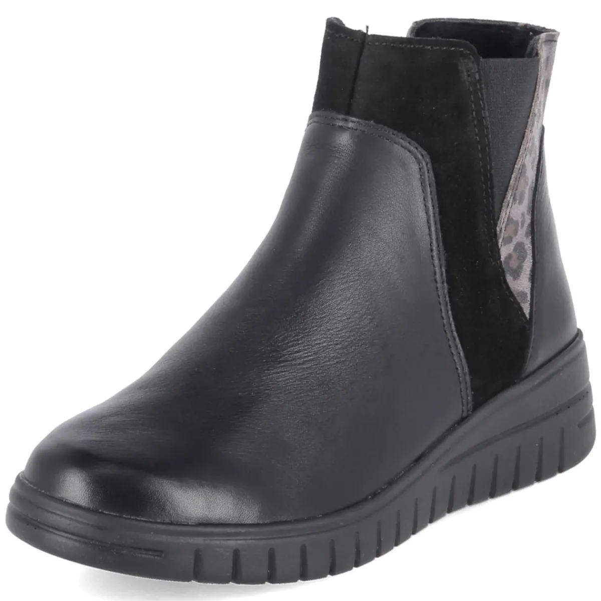 Die Stiefeletten ISLA 05 von Beliana vereinen klare Linien mit funktionalem Komfort. Schwarzes, langlebiges Echtleder und eine runde Schuhspitze schaffen eine zeitlose Silhouette, während das leichte Futter an kühlen Tagen angenehm wärmt. Der praktische Reißverschluss sorgt für einen bequemen Einstieg, unterstützt durch einen Elastikeinsatz am Schaft für passgenauen Halt. Ein herausnehmbares Fußbett eröffnet Spielraum für eigene Einlagen, die sehr flexible, rutschfeste Laufsohle begleitet trittsicher durch den Tag. Stabilität liefert der verstärkte Fersenbereich, ein dezent gemusterter hinterer Schaftteil setzt einen eleganten Akzent. Das Modell fällt größengetreu aus und zeigt sich citytauglich wie bürofein. Modetipp: Zu Straight-Leg-Jeans und einem langen Wollmantel wirkt das matte Leder besonders edel, eine strukturierte Strumpfhose unter Midirock betont das dezente Schaftmuster.