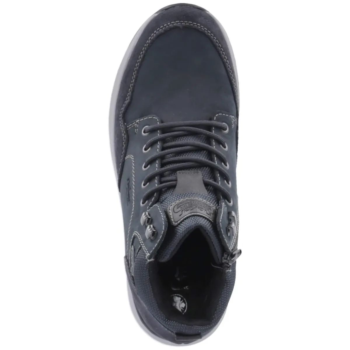 Dieser Winterboot von Rieker vereint wetterfesten Schutz und komfortable Wärme in einem markanten Herren-Modell. Obermaterial aus Leder und Synthetik sorgt in tiefem Blau für eine wertige Optik, während die runde Spitze und der gepolsterte Einstieg den Tragekomfort erhöhen. Warmfutter mit Wollanteil hält zuverlässig warm, zugleich bleibt der Schuh dank atmungsaktiver Ausstattung angenehm klimatisiert. Das wasserfeste Design und die flexible, rutschfeste Laufsohle geben Halt auf nassem Untergrund. Praktisch sind die Kombination aus Schnürsenkeln und seitlichem Reißverschluss sowie die Anziehlasche für einen schnellen Einstieg. Ein auswechselbares Wechselfußbett und eine weiche Textil-Decksohle unterstreichen den Komfort. Verstärkte Zehen- und Fersenbereiche erhöhen die Langlebigkeit. Die Passform fällt schmaler aus und harmoniert mit schmaleren Füßen. Modetipp: In Kombination mit Raw-Denim, Wollmantel und Strickmütze entsteht ein zeitloser Winter-Look mit sportiv-eleganter Note.