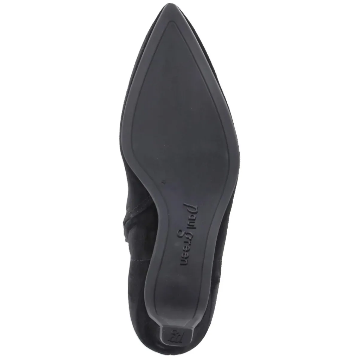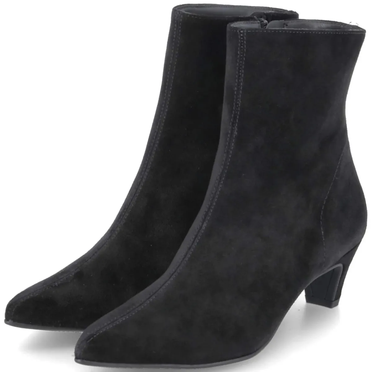 Die Ankle Boots von Paul Green verbinden feminine Eleganz mit verlässlichem Komfort. Das feine Obermaterial aus schwarzem Rauleder zeigt eine edel matte Struktur, während die spitz zulaufende Silhouette und der 5 cm hohe Trichterabsatz das Bein optisch strecken. Innen sorgt eine Decksohle aus Leder für ein angenehmes Fußklima. Der seitliche Reißverschluss ermöglicht einen bequemen Einstieg und hält den Schaft passgenau. Eine verstärkte Ferse stabilisiert, die flexible, griffige und rutschhemmende Laufsohle bietet Sicherheit im Alltag. Langlebiges Echtleder und sorgfältige Verarbeitung unterstreichen den Qualitätsanspruch der Marke. Der Schuh fällt normal aus und begleitet vom Business-Look bis zum Dinner stilvoll durch den Tag. Modetipp: Mit Cropped-Jeans und Oversize-Blazer entsteht ein moderner Office-Look; am Abend setzt ein Midirock aus Satin und eine blickdichte Strumpfhose einen eleganten Akzent.