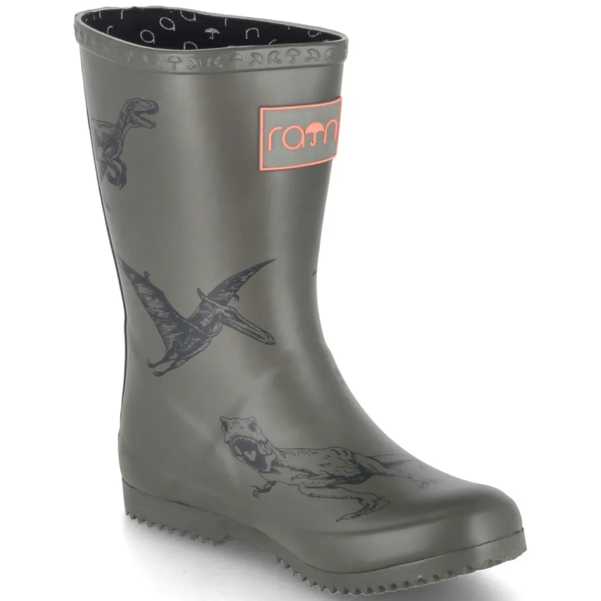 Mit dem grünen Gummistiefel von Rajn wird jedes Regenabenteuer zum Vergnügen. Das wasserfeste Obermaterial aus Gummi schützt zuverlässig, während das bedruckte Design mit verschiedenen Dinos in dezentem Schwarz spielerische Akzente setzt. Die runde Spitze und der Verzicht auf einen Verschluss sorgen für unkomplizierten Einstieg, der verstärkte hintere Schaft mit orangefarbenen Streifen gibt zusätzliche Stabilität. Innen bietet ein dünnes Textilfutter ein angenehmes Klima, das gepolsterte Wechselfußbett mit Textildecksohle erhöht den Komfort und lässt sich für individuelles Tragen herausnehmen. Die flexible, rutschfeste Profilsohle gewährleistet sicheren Halt auf nassem Untergrund. Der Schuh fällt normal aus und zeigt vielfältige Kombinationsmöglichkeiten. Modetipp: Besonders harmonisch zu gelber Regenjacke und dunkelblauer Jeans, dazu eine passende Mütze in Orange als Farbakzent.