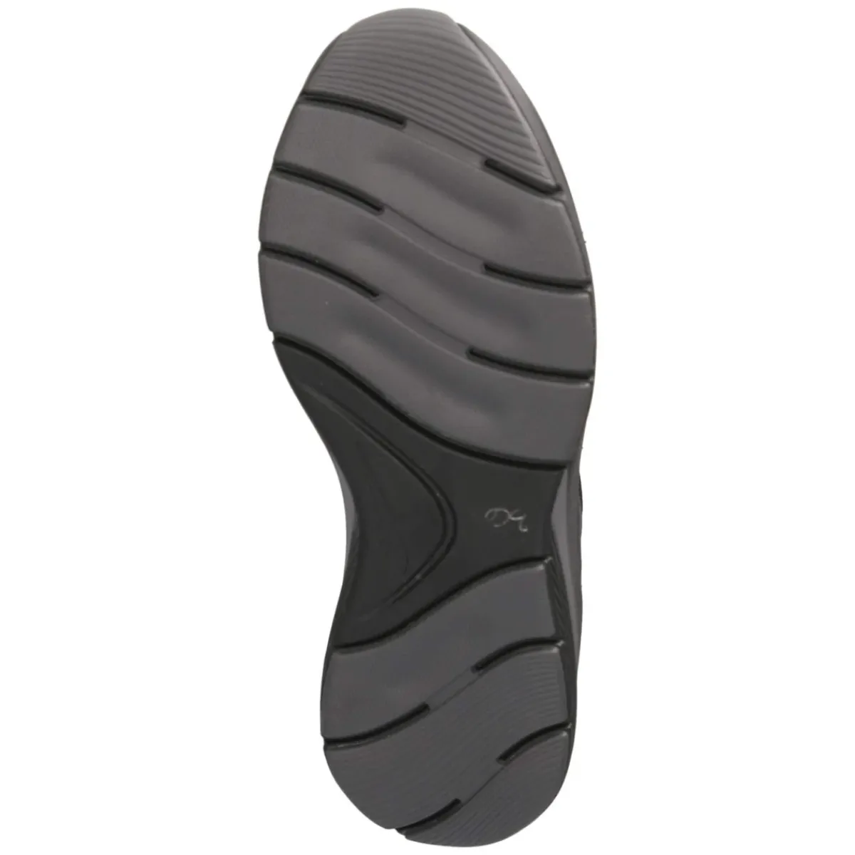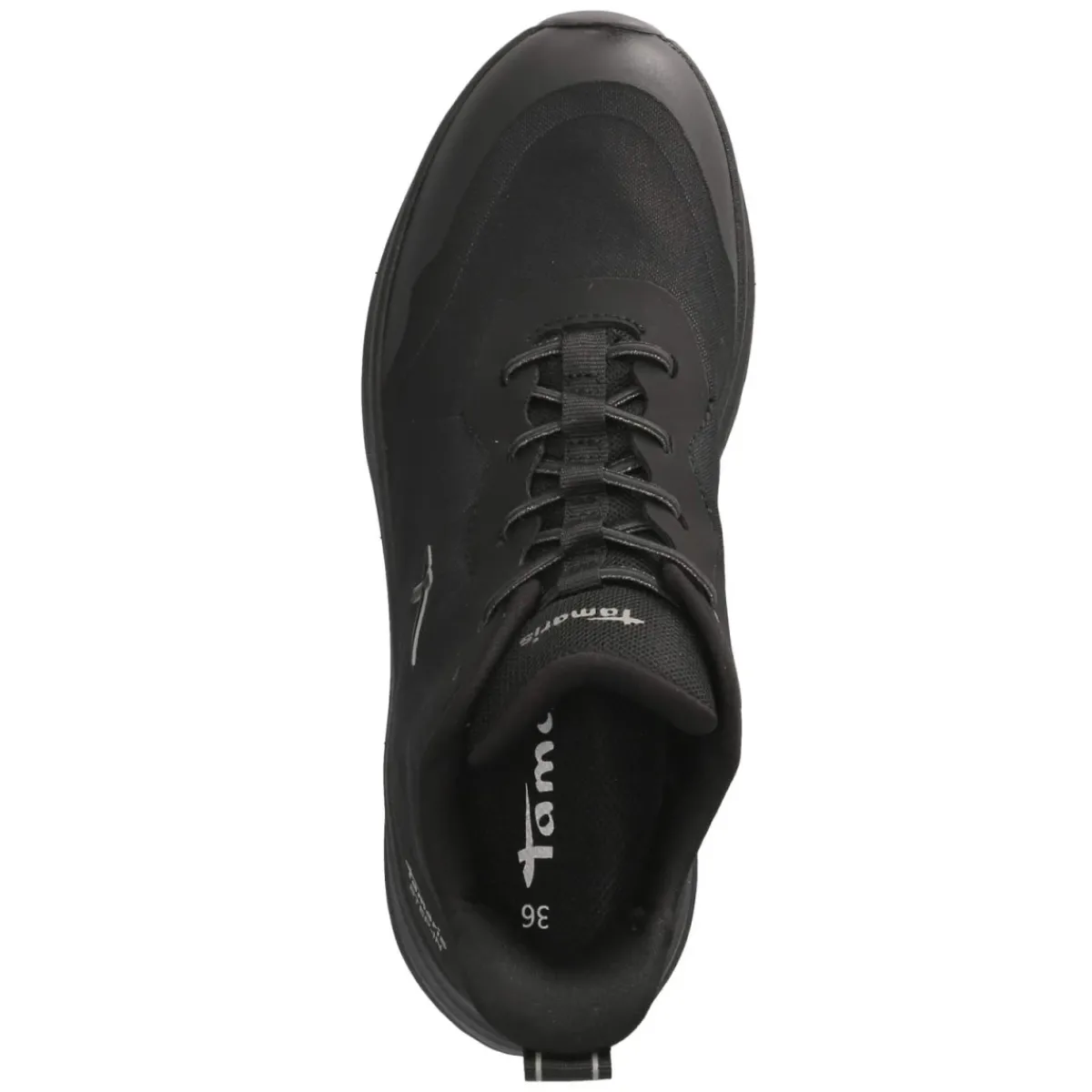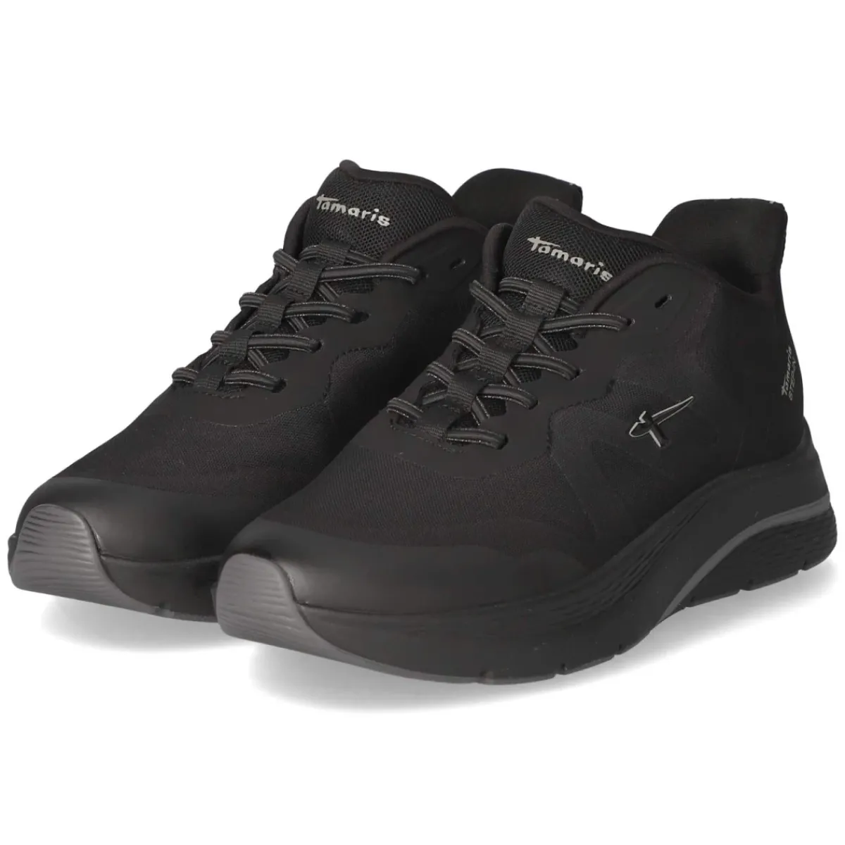 Der Low Sneaker von Tamaris setzt auf eine klare, schwarze Silhouette mit dezenten Akzenten in Grau und überzeugt mit konsequent veganen Materialien. Das strapazierfähige Obermaterial aus Textil und Synthetik umschließt den Fuß angenehm, während eine runde Schuhspitze und verstärkte Zonen im Zehen- und Fersenbereich für langlebigen Schutz sorgen. Ein elastisches Band ergänzt die klassische Schnürung und verleiht flexiblen Halt; die Anziehlasche erleichtert den Einstieg. Innen bietet die textile Decksohle ein komfortables Wechselfußbett, das bei Bedarf ausgetauscht werden kann. Die flexible, rutschhemmende Sohle sorgt für sicheren Tritt im Alltag. Der Sneaker fällt normal aus. Modetipp: Für einen urbanen Look zu Cropped-Jeans und schwarzem Blazer kombinieren, graue Socken greifen die feinen Farbakzente auf.