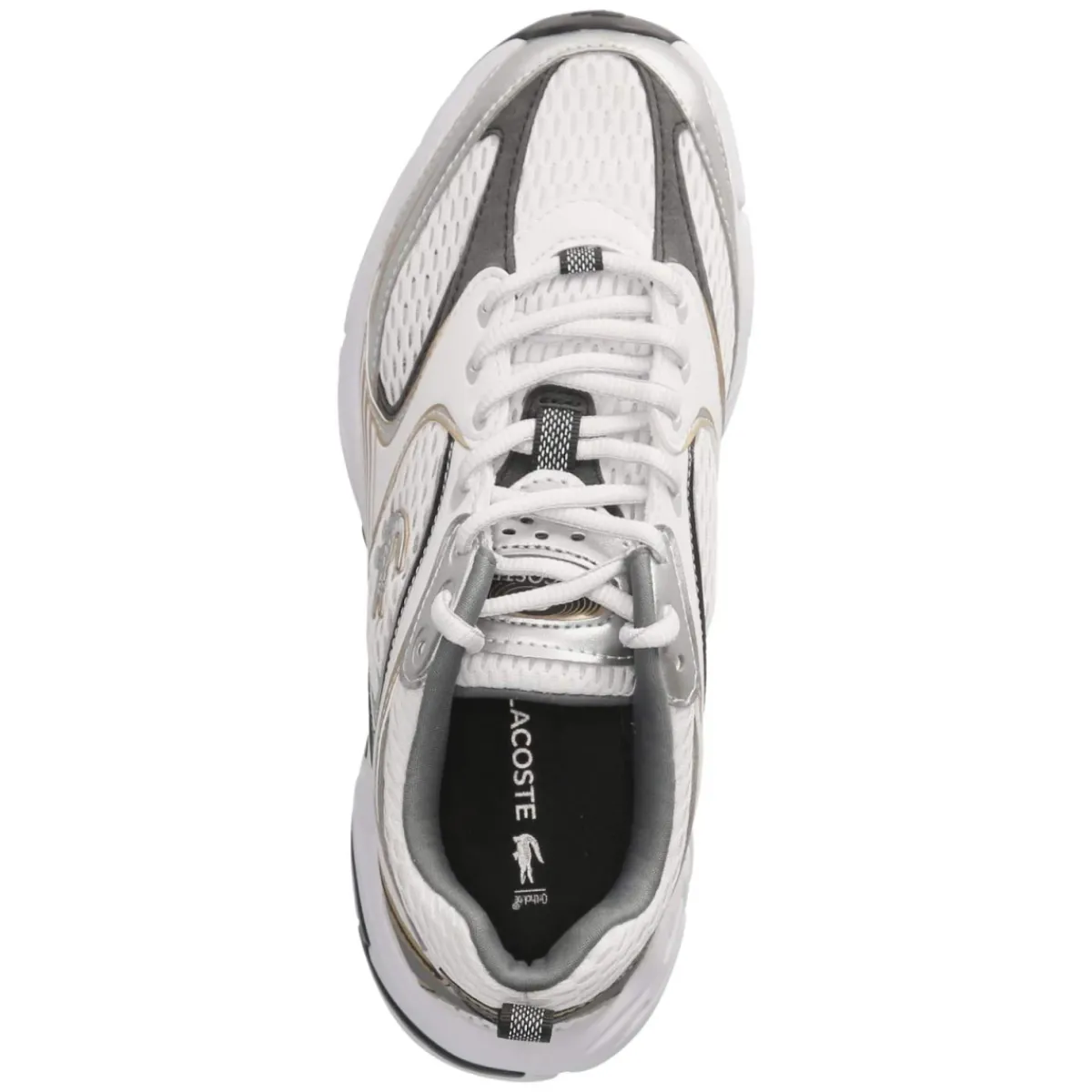 Der Low Sneaker STORM von Lacoste verbindet eine klare weiße Basis mit einem mehrfarbigen Spiel aus grauen und schwarzen Details sowie edlen Akzenten in Silber und Gold. Das Obermaterial aus leichtem Textil‑Synthetik‑Mix mit atmungsaktiven Mesh-Parts sorgt für ein angenehmes Klima, während der bequem gepolsterte Einstieg und das weich gepolsterte Fußbett Komfort im Alltag bieten. Die runde Spitze, die klassische Schnürung für individuelle Anpassung und die praktische Anziehlasche unterstreichen die sportive Silhouette. Eine flexible, rutschfeste Laufsohle verleiht Halt auf unterschiedlichsten Untergründen, die textile Decksohle rundet das Tragegefühl ab. Der Schnitt fällt normal aus und richtet sich an Damen, die einen urbanen, dynamischen Look bevorzugen. Modetipp: Besonders stimmig zu cleanen Wide-Leg-Jeans und einem strukturierten Blazer; Metallic-Details können in Tasche oder Schmuck subtil aufgegriffen werden.