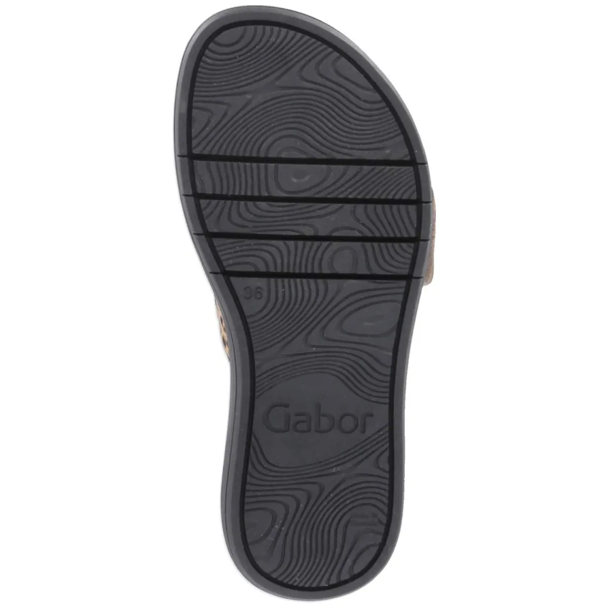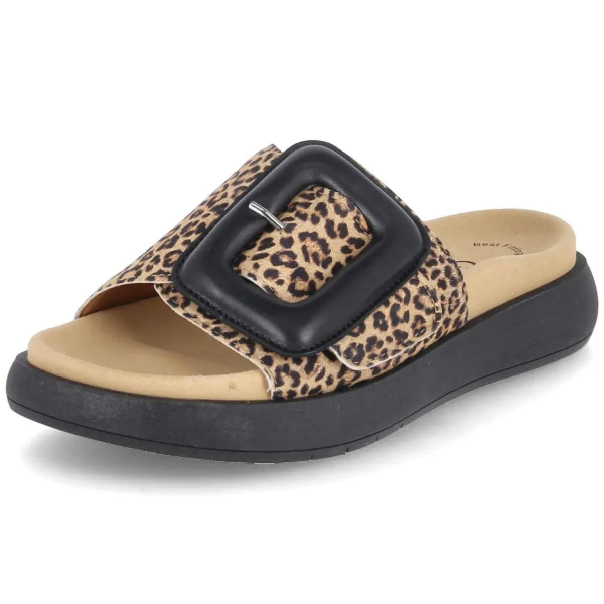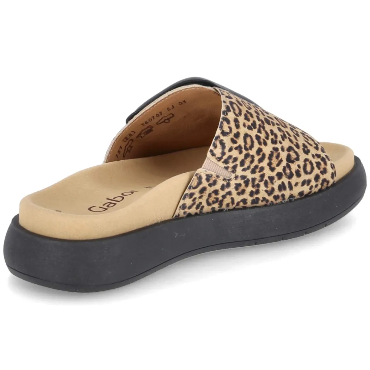Diese Pantoletten von Gabor verbinden sommerliche Leichtigkeit mit komfortorientierten Details. Das beige Rauleder zeigt eine samtige Oberfläche, akzentuiert durch einen dezenten Animal-Print im Leopard-Look, der den offenen Zehenbereich modisch rahmt. Ein bequemer Klettverschluss und ein kleiner seitlicher Elastikeinsatz sorgen für passgenauen Halt, während die vorgeformte Textil-Decksohle und das gepolsterte Tieffußbett den Fuß spürbar entlasten. Die starke, rutschfeste Laufsohle bietet sicheren Grip im Alltag. Das Modell fällt normal aus und richtet sich an Damen, die einen stilvollen Begleiter für warme Tage schätzen. Modetipp: Zu fließenden Midi-Kleidern in Naturtönen tragen, dazu eine Basttasche und feiner Goldschmuck für einen eleganten City-Look.