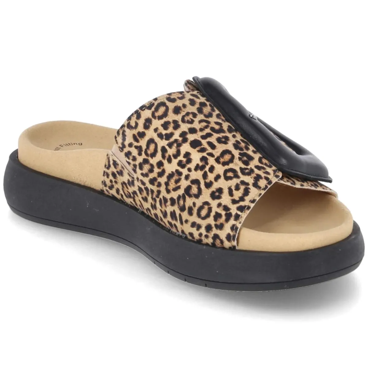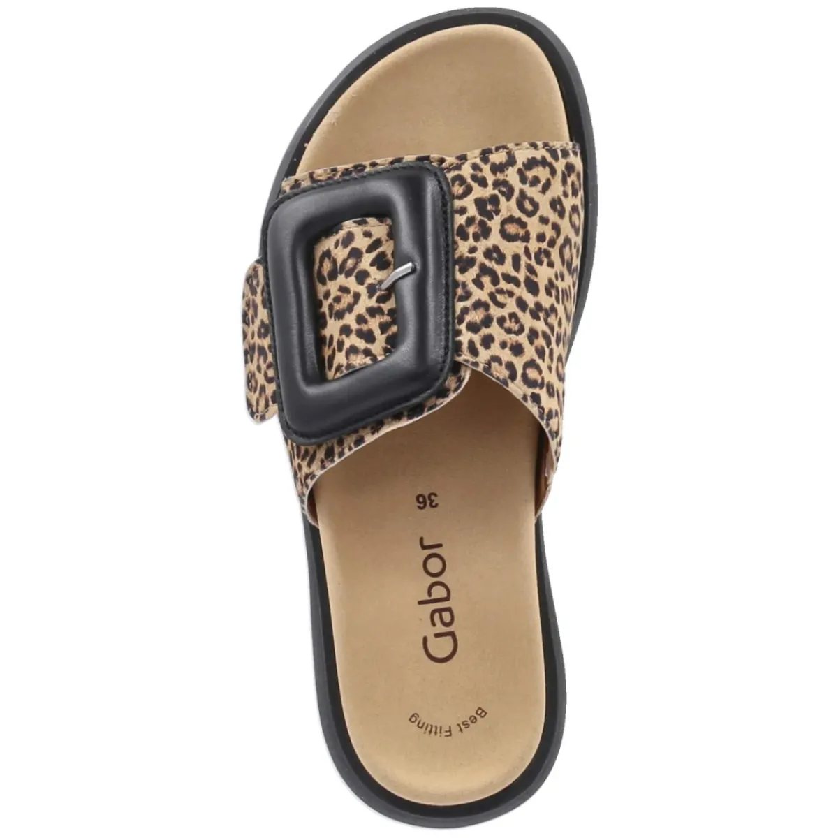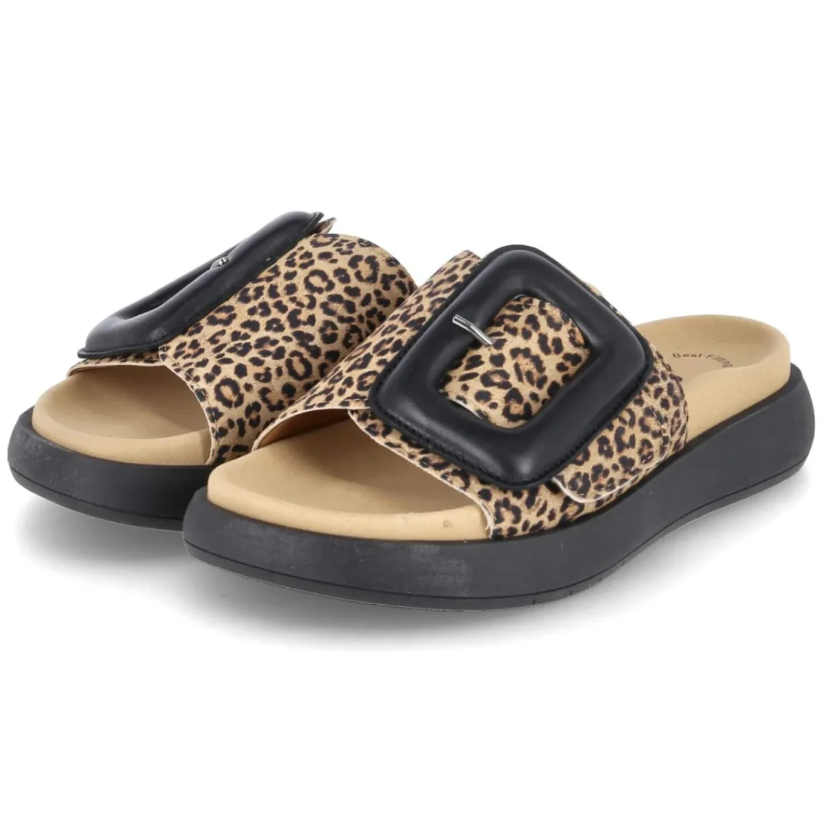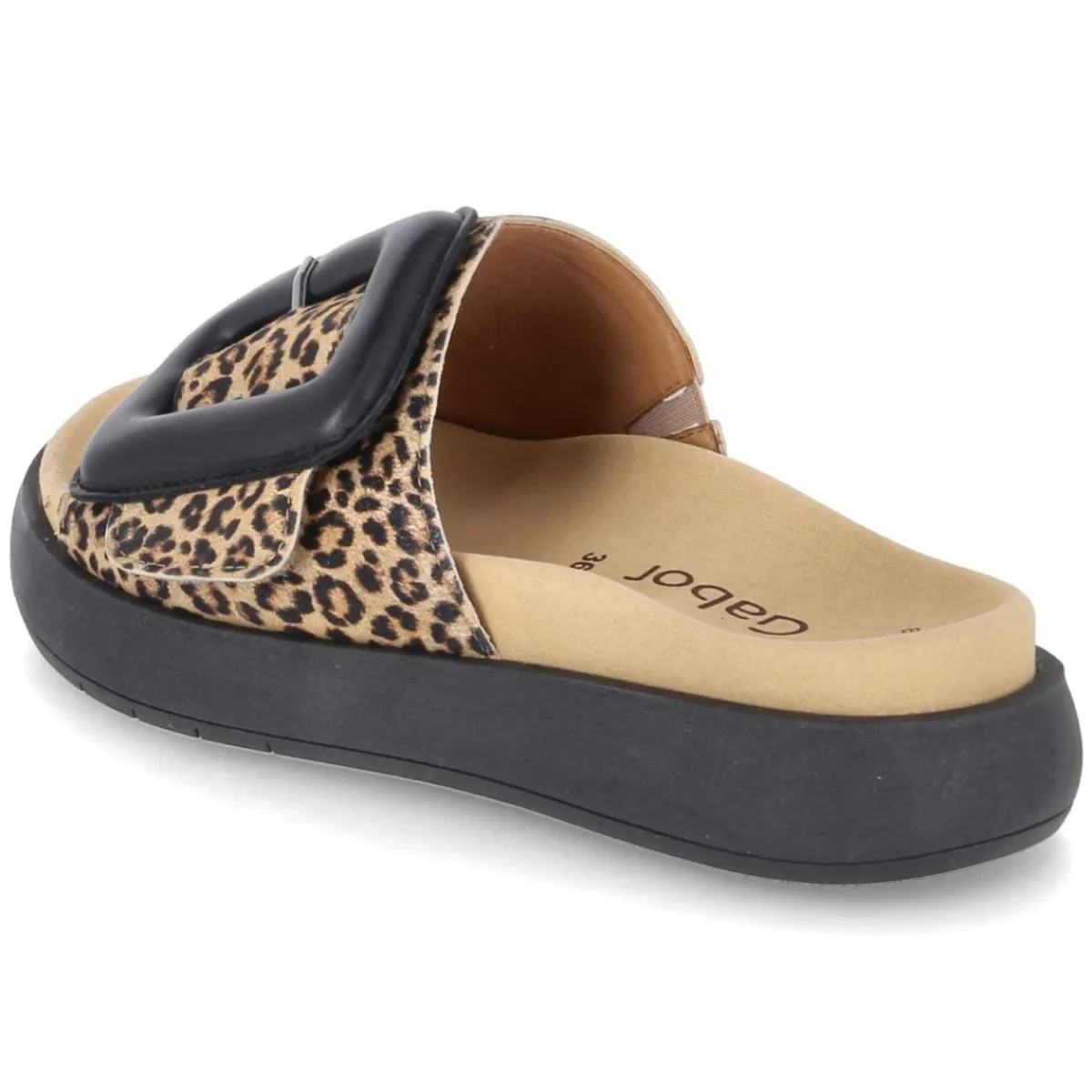 Diese Pantoletten von Gabor verbinden sommerliche Leichtigkeit mit komfortorientierten Details. Das beige Rauleder zeigt eine samtige Oberfläche, akzentuiert durch einen dezenten Animal-Print im Leopard-Look, der den offenen Zehenbereich modisch rahmt. Ein bequemer Klettverschluss und ein kleiner seitlicher Elastikeinsatz sorgen für passgenauen Halt, während die vorgeformte Textil-Decksohle und das gepolsterte Tieffußbett den Fuß spürbar entlasten. Die starke, rutschfeste Laufsohle bietet sicheren Grip im Alltag. Das Modell fällt normal aus und richtet sich an Damen, die einen stilvollen Begleiter für warme Tage schätzen. Modetipp: Zu fließenden Midi-Kleidern in Naturtönen tragen, dazu eine Basttasche und feiner Goldschmuck für einen eleganten City-Look.