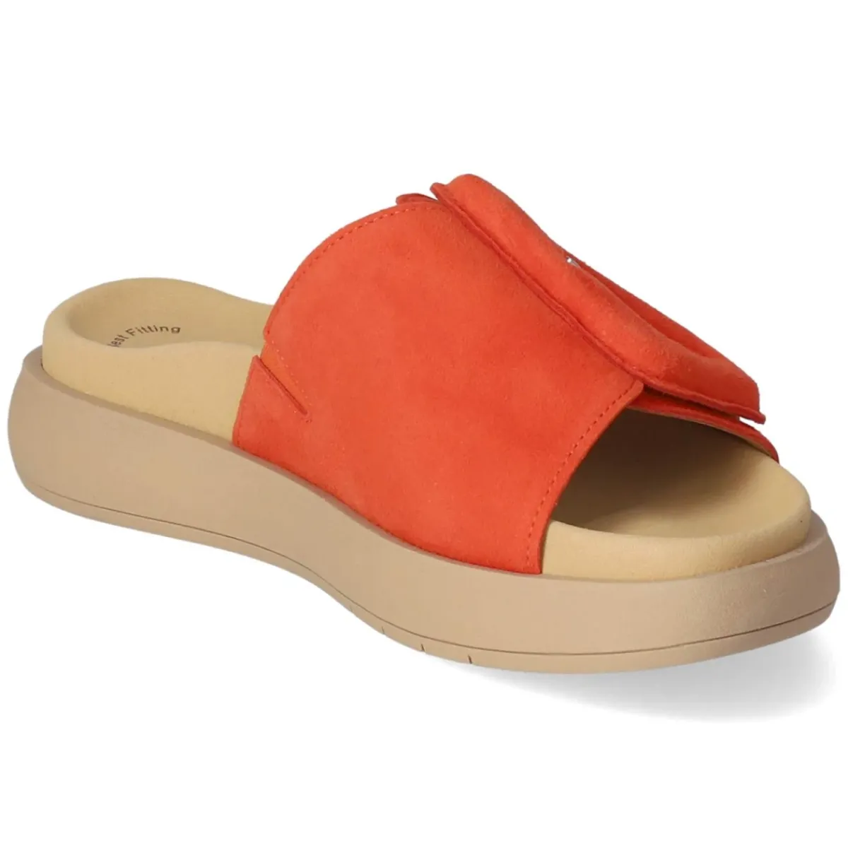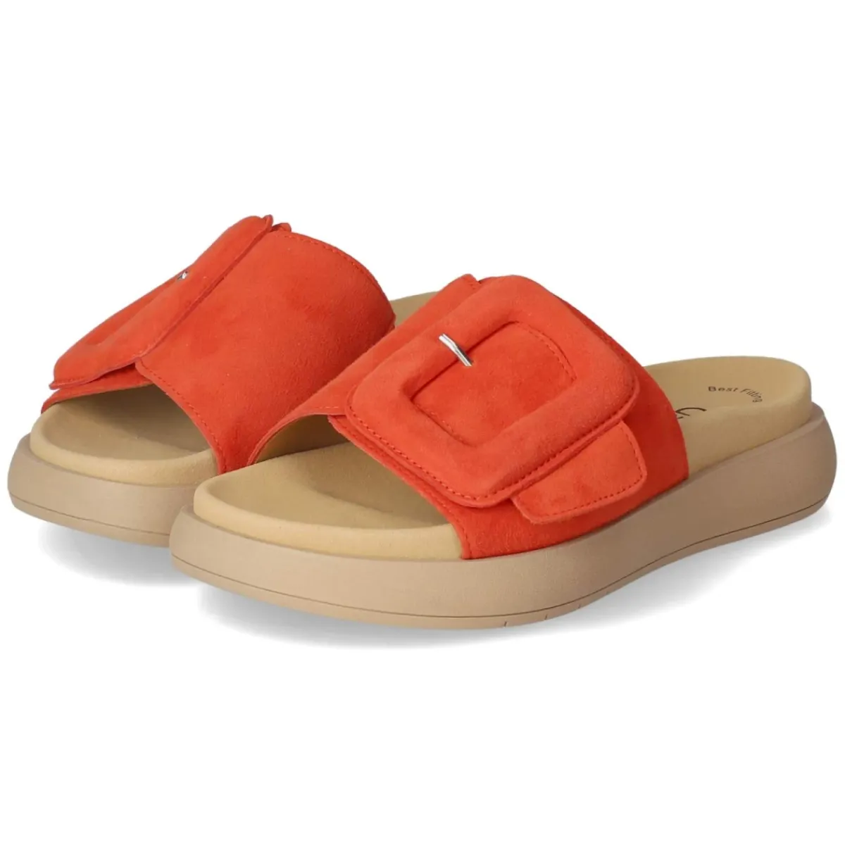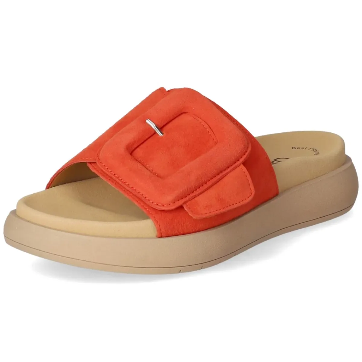 Diese Damen-Pantoletten von Gabor setzen in leuchtendem Orange ein frisches Sommerstatement und verbinden stilvolle Leichtigkeit mit Komfort. Das Obermaterial aus softem Rauleder umschmeichelt den Fuß, während atmungsaktives Echtleder für ein angenehmes Klima sorgt. Der offene Schnitt und der bequeme Klettverschluss erlauben individuelle Anpassung, das gepolsterte Fußbett unterstützt bei jedem Schritt. Eine Textil-Decksohle sorgt für zusätzliche Weichheit, die rutschhemmende Laufsohle gibt zuverlässigen Halt auf unterschiedlichen Untergründen. Praktisch im Alltag, citytauglich im Office und entspannt am Wochenende, fällt das Modell normal aus und lässt sich mühelos kombinieren. Modetipp: Zu einem cremefarbenen Leinenkleid, geflochtener Tasche und goldfarbenen Akzenten entsteht ein moderner Look, der die Orange-Nuance effektvoll in den Mittelpunkt stellt.