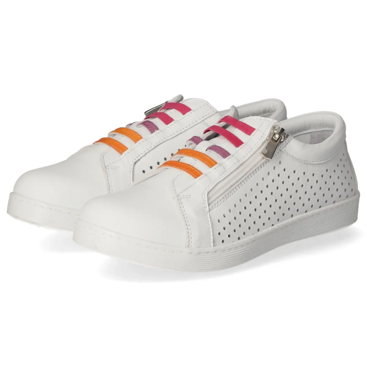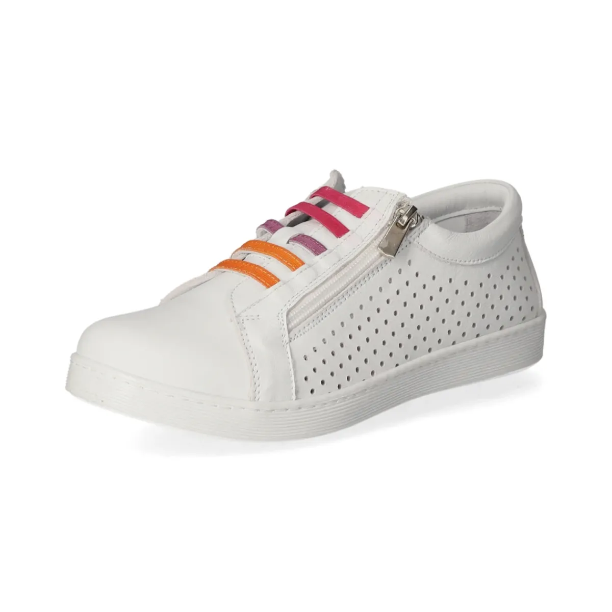 Der Slip-On-Sneaker von Andrea Conti zeigt cleanes Weiß in sportlich-femininer Form und setzt mit modischer Lochung und bunten Elastikbändern über dem Spann frische Akzente. Glattleder in langlebiger Qualität, eine rund geformte, verstärkte Zehenpartie sowie das angenehme Lederfutter sorgen für wertige Haptik. Der seitliche Reißverschluss ermöglicht einen bequemen Einstieg, die gepolsterte Wechseldecksohle entlastet und das komfortable Wechselfußbett lässt sich bei Bedarf austauschen. Für Alltagstauglichkeit stehen die flexible, rutschhemmende Laufsohle mit leichtem Profil und der Größenhinweis: fällt normal aus. Ein City-Sneaker für Damen, der Stil und Komfort vereint. Modetipp: Zu Cropped-Jeans und gestreiftem Bretonshirt entsteht ein lässiger Marinelook; ein heller Leinenblazer hebt das Weiß elegant hervor.
