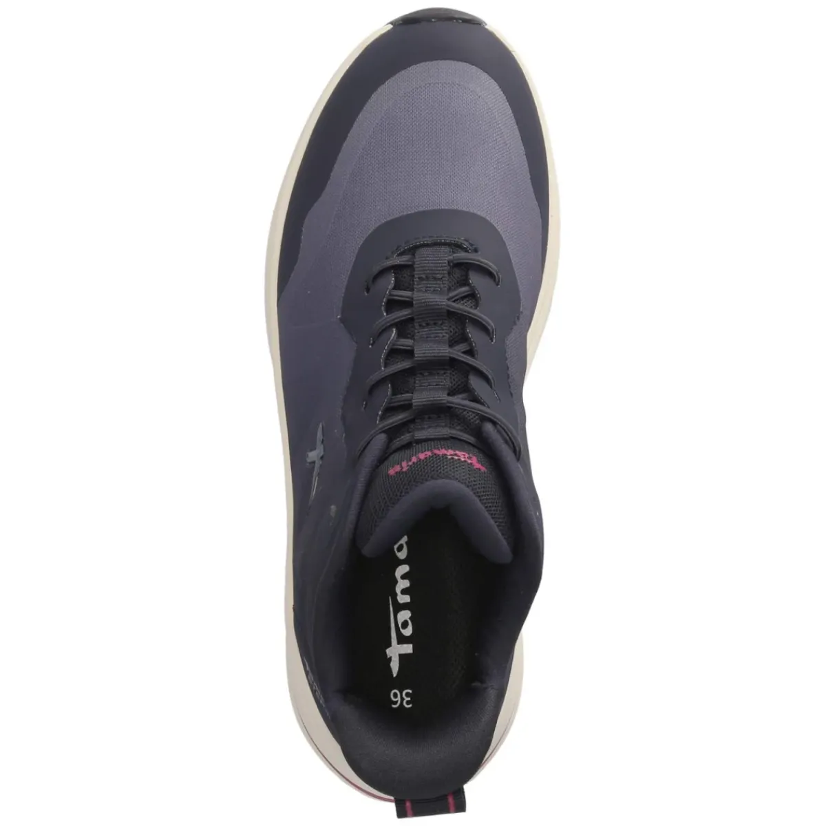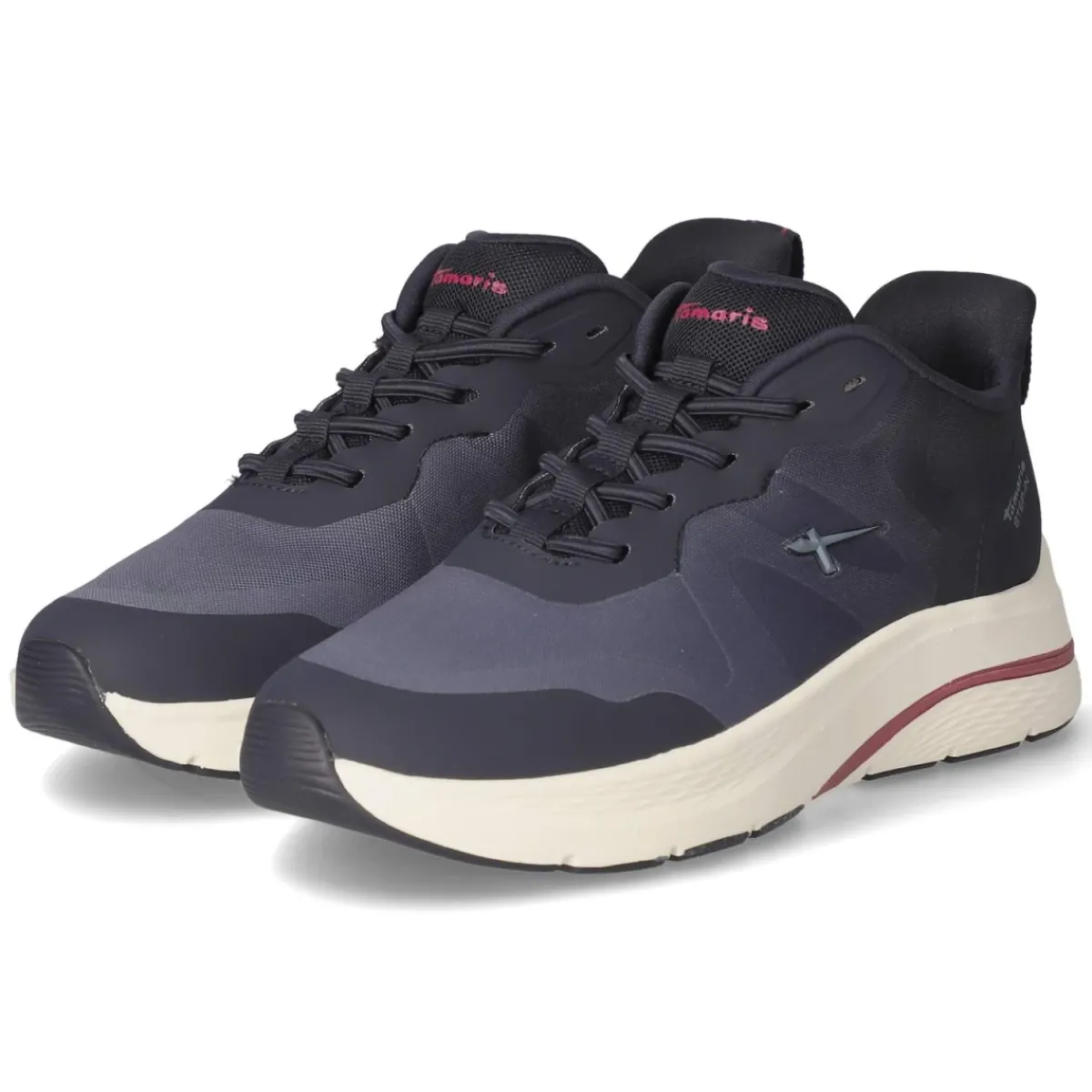 Der Damen-Sneaker von Tamaris zeigt sich in klarem Blau mit magentafarbenen Akzenten und verbindet sportliche Leichtigkeit mit urbanem Stil. Das Obermaterial aus Textil und Synthetik umschließt den Fuß weich, die runde Spitze bietet angenehme Zehenfreiheit. Ein Gummizug mit Elastikband sorgt für flexiblen Halt und erleichtert das Anziehen, unterstützt von der praktischen Anziehlasche. Verstärkte Bereiche an Zehen und Ferse erhöhen die Robustheit im Alltag. Für Komfort stehen eine gepolsterte, herausnehmbare Decksohle aus Textil und ein besonders bequemes Fersenpolster. Die flexible, rutschfeste Laufsohle begleitet sicher durch City und Büro; der Schnitt fällt größengetreu aus. Vegan verarbeitet, eignet sich der Sneaker ideal für moderne Alltagslooks. Modetipp: Helle Denim und ein Oversize-Blazer setzen die magentafarbenen Details frisch in Szene.