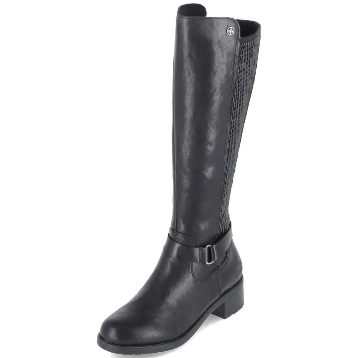 Dieser schwarze Damenstiefel von Rieker verbindet alltagstauglichen Komfort mit eleganter Zurückhaltung. Das pflegeleichte Obermaterial aus Synthetik zeigt sich in zeitloser Optik, während die runde Schuhspitze und der 4,5 cm hohe Blockabsatz für ein harmonisches Silhouette-Update sorgen. Ein bequemer Reißverschlusseinstieg erleichtert das An- und Ausziehen, der Varioschaft mit stretchigem, hinten geflochten wirkendem Einsatz passt sich unterschiedlichen Waden an. Das Schaftmaß liegt bei ca. 35 cm Höhe und 36 cm Umfang. Im Inneren sorgt ein leichtes Fleecefutter für behagliche Wärme, die textile Decksohle und das komfortable Wechselfußbett bieten angenehme Dämpfung. Eine flexible, rutschfeste Laufsohle gibt sicheren Halt, der zierende Knöchelriemen setzt einen dezenten Akzent. Modetipp: Mit Midikleid in Rippstrick und Oversize-Wollmantel entsteht ein lässig-femininer City-Look.