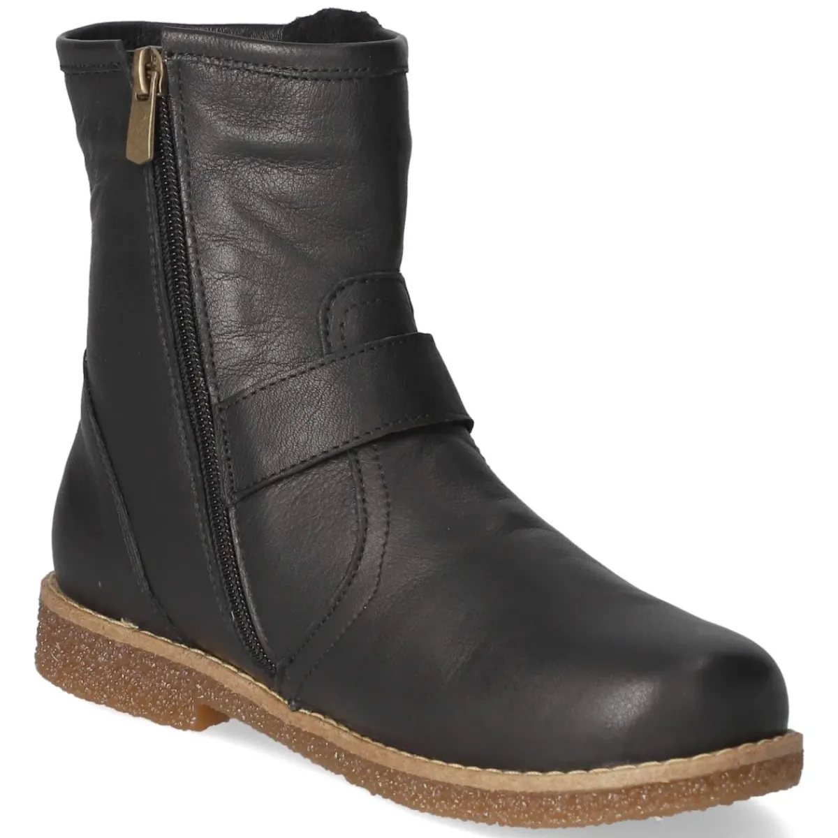 Diese Stiefeletten von Charlotte of Sweden verbinden klare Linien mit hochwertiger Verarbeitung. Glattes, atmungsaktives Echtleder in tiefem Schwarz formt eine runde Spitze und bietet dank leichtem Futter angenehmen Komfort an kühleren Tagen. Der bequeme Reißverschlußeinstieg erleichtert das An- und Ausziehen, während zwei breite Zierriemen mit goldenen Schnallen einen edlen Akzent setzen. Ein verstärkter Zehen- und Fersenbereich sorgt für Stabilität, die flexible, rutschfeste Laufsohle für sicheren Grip im Alltag. Das wechselbare Fußbett erlaubt die Nutzung eigener Einlagen; die Passform fällt normal aus. Modetipp: Mit Cropped-Jeans und Oversize-Blazer entsteht ein moderner City-Look, alternativ ergänzt ein Midikleid mit blickdichter Strumpfhose die elegante Note der goldenen Hardware.