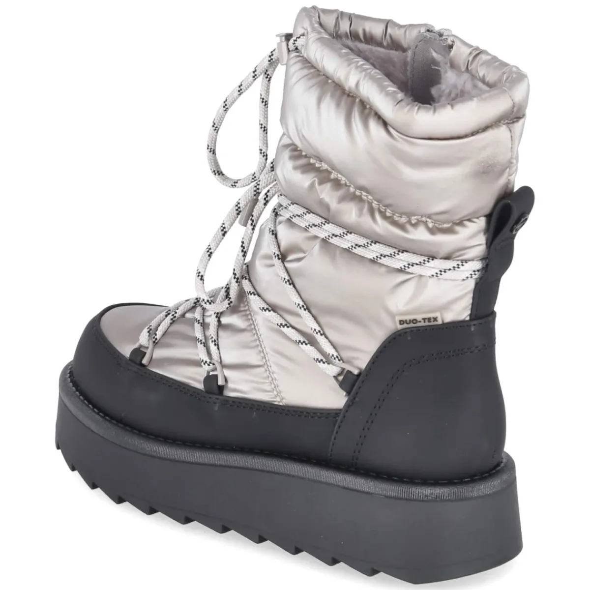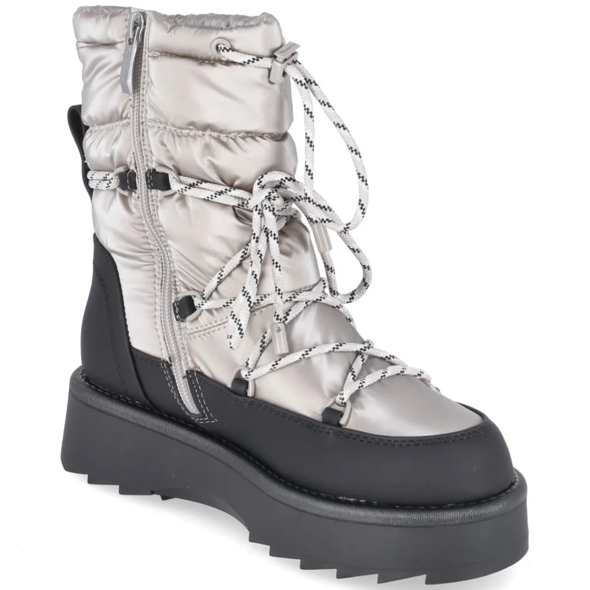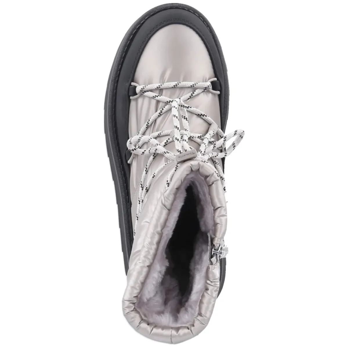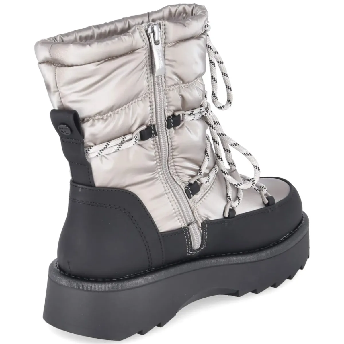 Der Winterboot von Tamaris verbindet Retrodesign mit modernem Komfort und setzt in silbernem Metallic-Look ein ausdrucksstarkes Statement. Vegane Materialien treffen auf ein flauschiges Warmfutter, das auch an kalten Tagen zuverlässig wärmt. Die wasserabweisende Ausrüstung hält Nässe in Schach, während der bequeme Reißverschlusseinstieg und der Schaft mit Kordelzug praktischen Nutzen bieten. Ein verstärkter Fußrahmen gibt zusätzliche Stabilität, die rutschfeste Profilsohle sorgt für sicheren Tritt. Mit 4,5 cm Plateauabsatz, runder Spitze und Wechselfußbett bleibt der Tragekomfort den ganzen Tag erhalten. Der Schaft misst ca. 17 cm Höhe und 30 cm Umfang, die Passform fällt normal aus. Textildecksohle und Synthetik-Obermaterial runden die robuste Ausstattung ab. Modetipp: Der metallische Glanz harmoniert besonders gut mit einem cremefarbenen Steppmantel und grob gestrickter Mütze für einen urbanen Winter-Look.