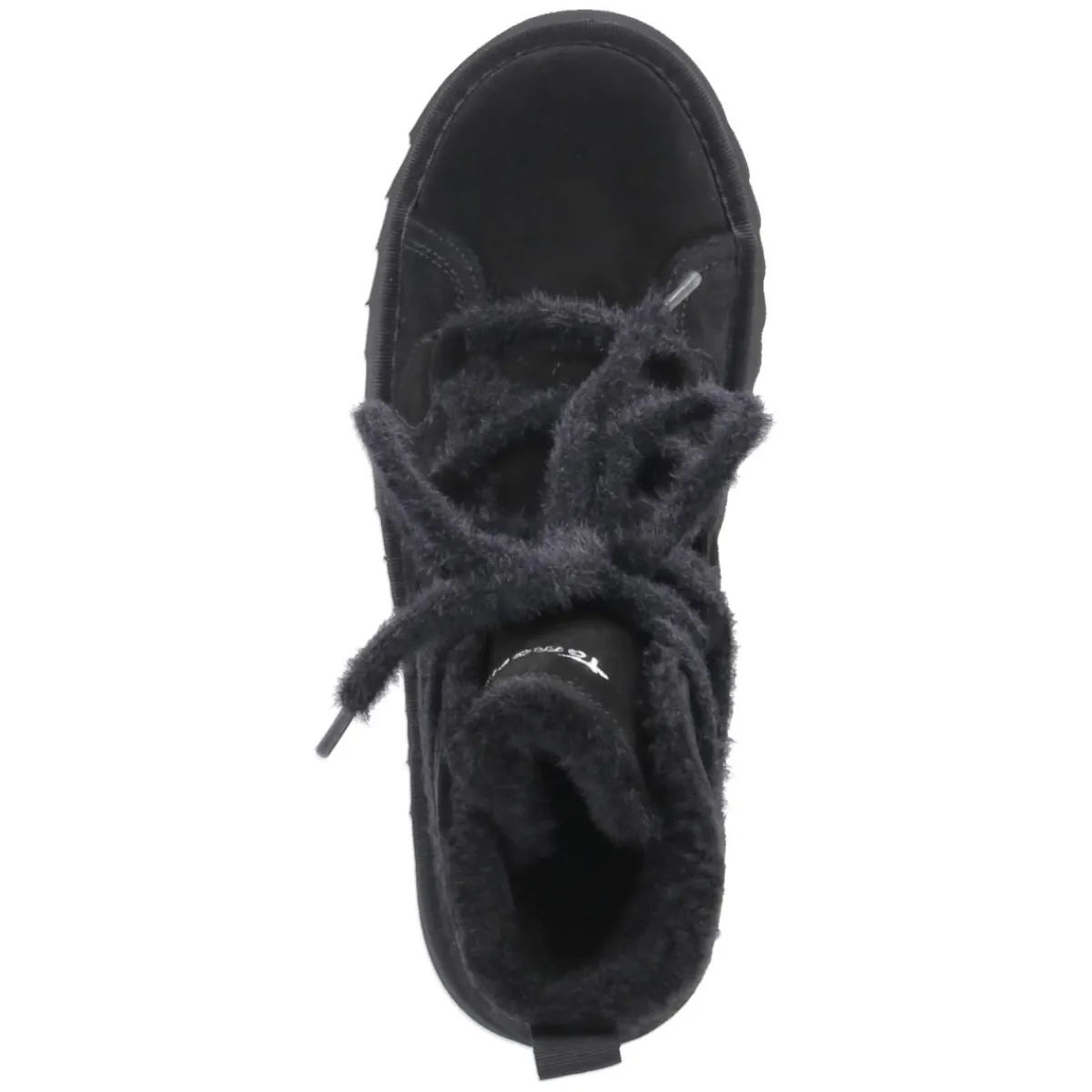 Dieser Winterboot von Tamaris für Damen verbindet urbane Lässigkeit mit funktionaler Wärme. Schwarzes Rauleder in langlebiger Echtleder-Qualität trifft auf ein kuschliges Warmfutter, das an kalten Tagen zuverlässig schützt. Die runde Spitze und die flauschige Schnürung sorgen für eine weiche Linienführung, während die verstärkte Ferse Stabilität gibt. Das gepolsterte Fußbett und die textile Decksohle bieten sanfte Dämpfung, das relaxt leichte Tragegefühl entlastet auf langen Wegen. Mit 3,5 cm Plateauabsatz und einer Plateausohle mit leichtem Profil entsteht ein solider Stand und dezente Höhe. Der Schuh fällt normal aus und passt damit unkompliziert in die Alltagsgarderobe. Modetipp: Zu einem Wollmantel in Camel, Strickkleid und blickdichten Strümpfen entsteht ein zeitloser Winterlook; ein schwarzer Oversize-Schal hebt die samtige Struktur des Rauleders hervor.